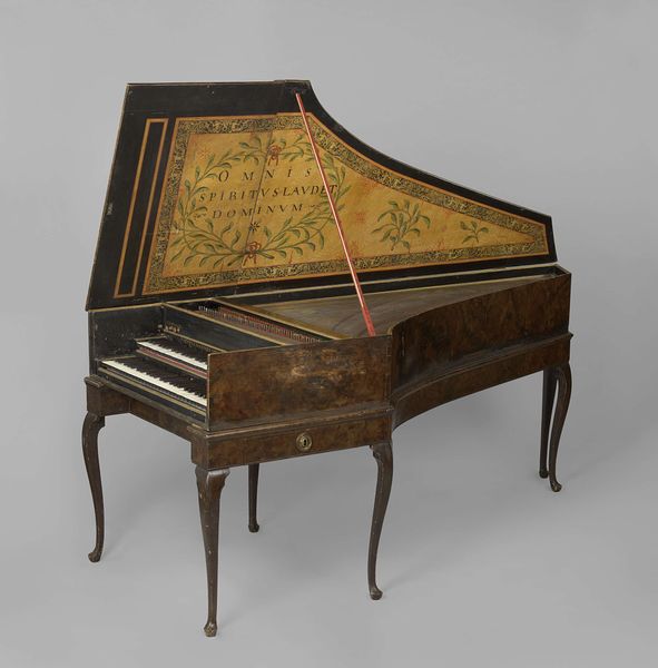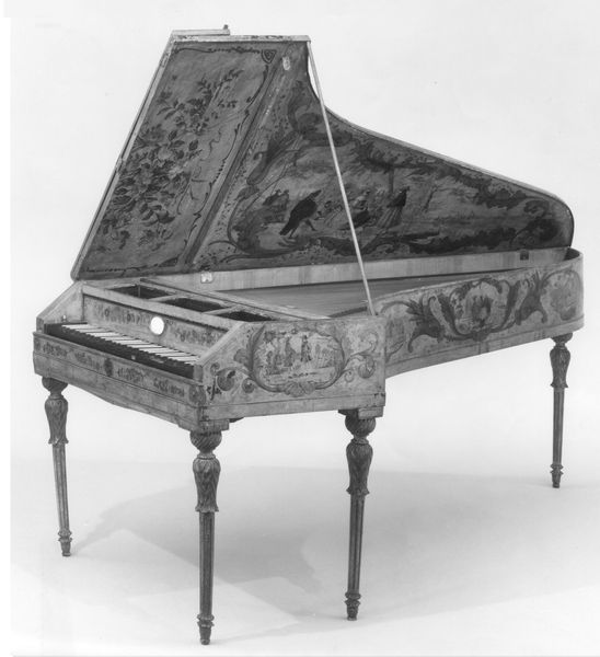 Curator: I'm struck immediately by the richness, the opulence! It's visually…delectable. Editor: It is, isn’t it? What we have here is a harpsichord crafted around 1742 by Louis Bellot, a French instrument maker. You'll notice it's not just the form, but the extensive painting and gilding that elevate it beyond mere utility. Curator: Exactly. It’s practically shouting wealth and status. All that gilding coupled with these pastoral scenes feel loaded with meaning. Is it meant to symbolize the harmonic ideal of the time? Editor: I think the iconography does speak to the pursuit of harmony, both musically and socially. Think about the cultural moment. Baroque France placed huge emphasis on artistry as an expression of political power, legitimizing social structures. Musical patronage itself reflected an unequal social contract. Curator: The very fact that this musical instrument exists as a work of art, rather than a functional item, seems to underscore class divisions, suggesting how distant most people were from such artistry or privilege. What's the historical context in terms of who owned this, what was the space in which music was played in relation to shaping elite experience? Editor: Precisely. These instruments weren’t just decorative; they were active agents within complex power dynamics of that era. These types of commissions offered marginalized artisans financial opportunities, so class is visible even in authorship. Then as now, fine artwork often rests on unequal access. The instrument stands now as a reminder of this. Curator: Its purpose in society—its symbolic capital, as Bourdieu would say—dwarfed its function. Looking closely at the symbolism allows us to analyze broader social and political structures through something as intimate and sensual as the act of making music. The harpsichord as a statement of domination. Editor: It’s fascinating to consider how potent symbols, even seemingly decorative ones, can carry a complicated story when you look closely. I find this particular Harpsichord endlessly alluring and visually appealing because it gives a voice to complex histories and allows us to hear an echo of those structures still reverberating.