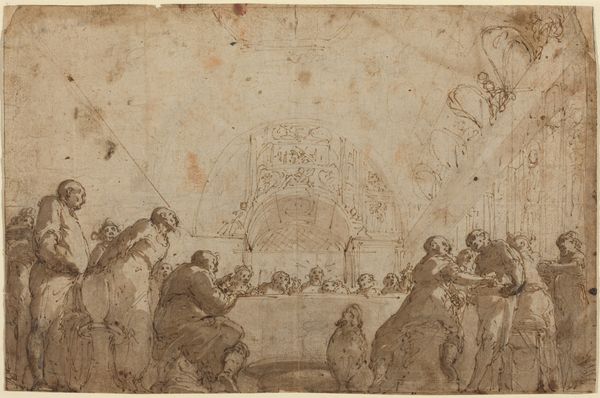 Francesco Guardi sketched these Venetian scenes using pen and brown ink, capturing a world animated by ruins and bustling quays. The architectural ruins, reminiscent of triumphal arches, serve as poignant symbols. These structures once celebrated power and empire. Yet here, they stand weathered and incomplete, acting as vanitas motifs that reflect the transience of human achievement. We see such ruins echo through time—from Roman frescoes to Renaissance paintings. They are perennial reminders of time’s passage and the cyclical nature of civilizations. Consider how the ruined arch appears in other contexts, such as Piranesi's engravings. In this context, it evokes a melancholic reflection on the grandeur of the past. Such imagery taps into our collective memory, conjuring feelings of nostalgia and the inexorable march of time. This composition, imbued with both energy and decay, invites us to contemplate how past glories continuously resurface. They evolve and find new meanings in our present.