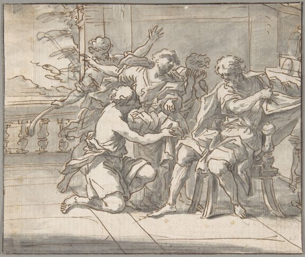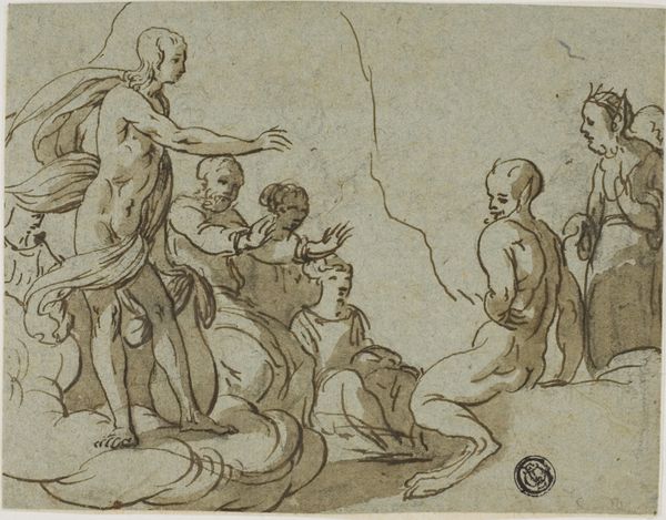 Editor: Here we have Giovanni Andrea Carlone's "Adam and Eve after Their Expulsion with the Infants Cain and Abel," created sometime between 1639 and 1697, using pen and brown ink, with white heightening, on toned paper. The figures appear very muscular, but also somewhat melancholy. What strikes you about it? Curator: The strength of the figures juxtaposed with the subdued medium immediately highlights the social narratives embedded within the work. This drawing exists, first and foremost, within the context of patronage. Carlone, working during the Baroque period, would have been keenly aware of the expectations of his audience, which greatly informs his imagery. The very act of depicting Adam and Eve, not in paradise, but *after* their expulsion speaks volumes. It shows us the impact that institutional powers – divine authority in this case – had on the everyday lives, even imagined ones, of the faithful. Editor: So the emotional state is less about individual suffering and more about the consequences of societal rules? Curator: Precisely. Consider how the depiction of labor, usually glorified, here carries a weight of divine punishment. Adam toils, Eve nurses – these are presented not as virtues, but as burdens. The muted tones further emphasize this somber societal condition, suggesting the dawn of a new, harsher social order imposed by divine judgment. Even the landscape, or lack thereof, subtly highlights the sense of a world deprived, barren both literally and metaphorically. Editor: It's interesting how much we can read into what's not there! Thanks, I see this with new eyes. Curator: Indeed. By analyzing these historical markers, we unlock a deeper understanding of both the artwork itself and the world in which it was produced and consumed. It reveals the potency of art as a tool for understanding and critiquing power dynamics.