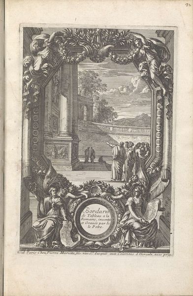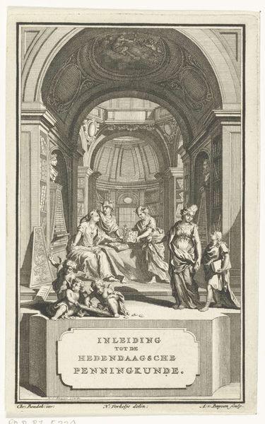 Curator: Gosh, this is a dense one, isn't it? A real explosion of baroque ornamentation. It kind of tickles my brain. Editor:Indeed! We're looking at an engraving from 1708, a title page designed by Andries van Buysen the Elder. The complete title is 'Titelpagina voor: Huwlykszangen ter vereeniging van den heere Jan Walraven...Met mevrouwe Margareta Trip'. So, essentially a wedding announcement, albeit a very elaborate one. Curator:A wedding announcement to end all wedding announcements, more like! I'm overwhelmed but...in a good way. All those figures, the grand architecture...it's theatrical, celebratory! Editor: Absolutely. Let's break it down. Note the heavy use of allegory here. Figures representing virtues and mythological characters populate the scene, flanking the central inscription. See how the strong, masculine figures with bludgeons give way to classical columns, cherubic infants, and softer feminine forms on the upper tiers? It functions structurally like an ideological barometer! Curator: Yes! There's a real sense of moving from chaos to harmony, doesn't it? Like marriage taming the wildness or something. Though, a bit heavy-handed, no? I also love the way those little cherubs seem to be bursting out from everywhere. A promise of fertility perhaps, a playful chaos that tempers the stoic grandeur. Editor: Observe the symmetry. Van Buysen creates a structured visual program by employing mirrored statues to control access to the central wedding vignette. This engraving acts as both an advertisement for the book and an allegorical pronouncement about the state. We can appreciate how lines move us across thematic registers throughout. Curator: Okay, I'm getting lost in art speak. But yeah, point taken about that structural rigour. I still feel that energy beneath the surface, like everything's ready to start dancing. This wasn't just ink on paper, but an event in itself. And in the end, that’s what resonates the most, that tangible sense of joyous occasion. Editor: Ultimately it asks questions, and the best art is suggestive of meaning that never fully materializes, yet shapes our experiences nevertheless. Curator: Beautifully put. Here’s to Van Buysen and to lasting love, as wild or as harmonious as it might be!