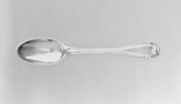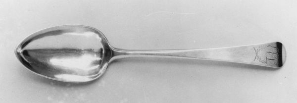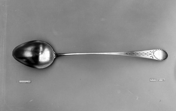 This is an eight and a quarter inch long spoon made of silver by Thomas Sadler sometime in the early 18th century. The spoon presents a study in gentle curves and reflective surfaces. The ovoid bowl gives way to a slender stem, subtly tapering to a flattened, stylized finial. Light plays across its polished form, accentuating the metal's cool, tactile quality. One might consider the spoon's structure as an embodiment of utility meeting design. The balanced composition speaks to a culture where even everyday objects were imbued with a sense of refinement. The spoon is also an instrument of social meaning. Its form alludes to societal norms of dining, hierarchy and status. The seemingly simple spoon becomes a signifier of cultural codes, offering insights into the aesthetic and social values of its time.