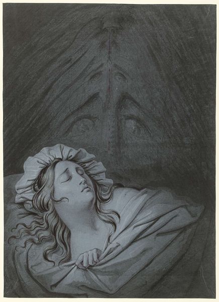Curator: Charles Herbert's "Study of the Head of the Sleeping Saint Ursula, after Carpaccio, in the Academy of Venice," presents us with a captivating moment of repose. Editor: It’s so serene! The way the light falls on her face, almost dreamlike. It makes you wonder what she's dreaming about. Curator: Herbert's work functions as a study, focusing on the artistic process. The medium itself-- its materiality-- invites us to consider the labor of art, the act of imitation, and the cultural value placed on these reproductions. Editor: I love how intimate it feels, though. Like we've been granted access to a private, sacred space. I find that detail on her sleeve particularly striking, like delicate bandages. Curator: Consider the source, Carpaccio, and the societal implications of canonizing art through replicas like this. Herbert’s choice of materials and technique also reinforces the artistic lineage. Editor: It feels like a gentle whisper across centuries; it's really lovely. Curator: Indeed, tracing the means of its production, from inception to realization, reveals so much. Editor: Absolutely. A lovely glimpse into the creative process.