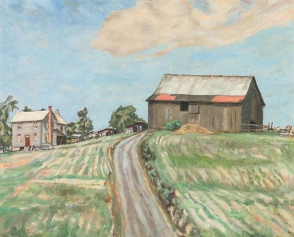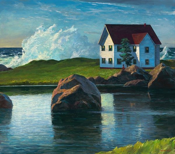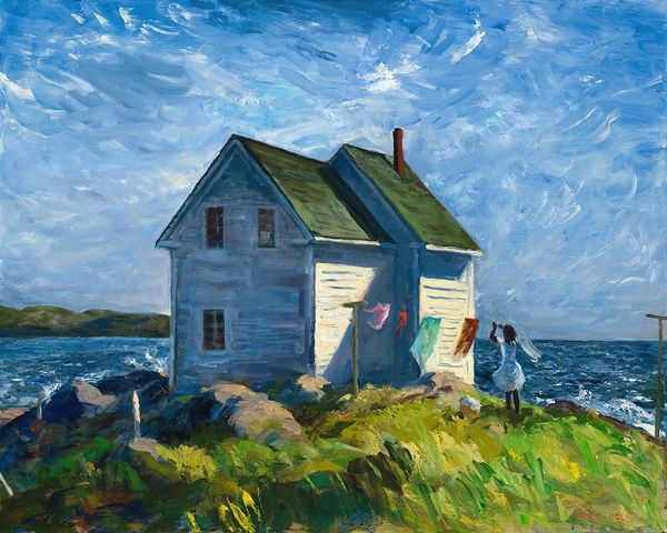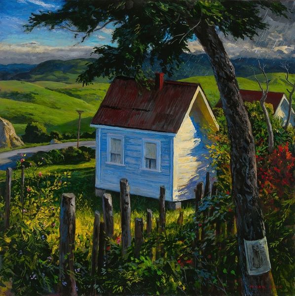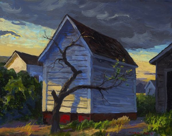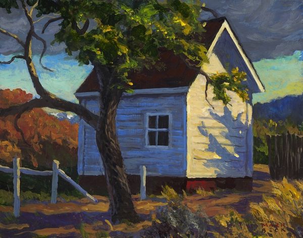 Curator: I find this piece deeply evocative; there's something almost Hopper-esque in the way the light hits those simple structures. Editor: You’re right, a quiet sort of narrative emerges here. We're looking at an oil painting titled “Down South” by Mark Beck, portraying a sun-drenched scene dominated by what appears to be a weathered house under a vivid sky. Curator: That title resonates. “Down South” isn't just geographical; it’s a state of mind. Notice the intensity of the light and how the shadow almost swallows parts of the building whole. There is a touch of vulnerability. Editor: It’s certainly a striking contrast, playing with illumination and shadow in a carefully orchestrated way. Looking closely, the brushwork appears quite deliberate and almost segmented—emphasizing texture while building form. I’d argue that it brings attention to the materiality of the paint. Curator: Materiality absolutely! Those heavy strokes, particularly in the foreground vegetation, give a real sense of place. You can almost smell the damp earth after a long day. Editor: Observe, too, how the telephone pole slices vertically through the right side of the canvas. In purely formal terms, it serves as an anchor, almost daringly positioned against the softer undulations of the landscape and the building’s geometry. Curator: And emotionally, it plants a quiet melancholy in me. Those utility poles always get to me. I have a sense of the artist contemplating how technology has encroached into rural settings. I'm drawn to how that stark utility contrasts with nature's beauty, like seeing a shadow across the sun. Editor: It invites precisely that duality—a testament to how structured pictorial devices and evocative subjects coalesce within a painting’s architecture. The overall balance—that interesting interplay—provides “Down South” with its distinctive voice. Curator: Absolutely, an image and experience combined in Beck's interpretation—beautiful, if a bit lonesome. Editor: Yes, that sums up the art nicely, balancing pure observation and evocative atmosphere, it really stands up to examination.