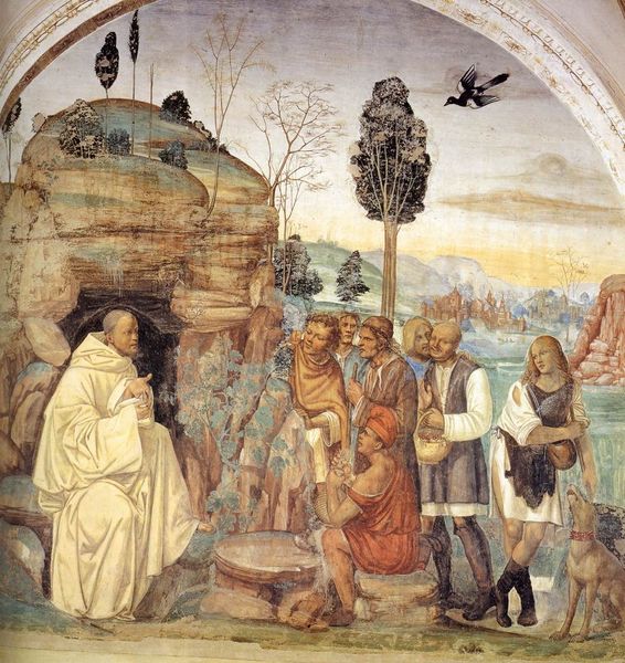 Editor: Here we have Il Sodoma's "Life of St. Benedict, Scene 12: Benedict Receives Maurus and Placidus," a fresco dating back to 1508. There's such a large crowd depicted here, and the architecture framing the scene seems grand and somewhat imposing. How would you interpret the meaning behind all these figures within a historical context? Curator: Well, considering this was painted during the High Renaissance, and looking at its location—presumably part of a monastic complex—the sheer number of figures is deliberate. Sodoma uses the space to visualize the burgeoning influence of the Benedictine order. What appears to be a reception is, in a sense, a symbolic display of power and social impact. How do you think the artist portrays St. Benedict within that context? Editor: He is very central, with that big, cream-colored robe that catches the light. Everyone else seems to look at him, almost seeking his approval. It is like a staging of influence and the saint's control of his image. Curator: Precisely. Think about who commissioned this fresco and why. Monasteries weren't just religious centers, they were also landowners, economic players. Images like this reinforced their social legitimacy and advertised their piety to the public, didn’t they? Do the architectural settings also echo this agenda? Editor: That’s very clear when we look at them more closely. These are no peasant dwellings; these are imposing, Renaissance structures in this very organized arrangement, hinting at the power and established place that Benedict and his Order have in this time and place. They provide a stunning background. Curator: Exactly. It’s not just a biblical scene; it’s a statement about institutional power rendered during the High Renaissance through the conventions of its artistry, with particular Renaissance tastes evident in the details of buildings and clothing. It shows us how art served to legitimize authority. Editor: I never considered how literally an image could "advertise" an institution. This changes how I will view art, seeing it in its societal context. Curator: And understanding that context lets us decode the multiple layers of meaning an artwork can hold.
