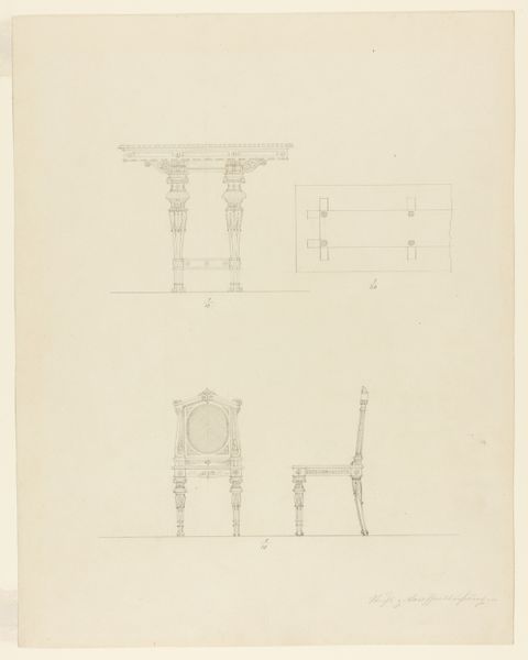 This is a pencil on paper artwork titled, "Designs for Four Chairs," by Charles Hindley and Sons. The composition is structured around the repetition of a single motif: a chair. Each chair is rendered with precision, emphasizing its geometric form. Notice how the fine pencil lines create not just shape but also texture, implying the materials from which these chairs might be constructed. The chairs exist in a shallow depth of field, flattening them and drawing attention to the lines. The chairs evoke a sense of order and design, reflecting the 19th-century interest in functionality. The semiotic play here relies on the cultural understanding of chairs as functional objects, yet these designs elevate them to aesthetic forms. The chairs suggest a challenge to fixed meanings by presenting common objects as subjects of artistic exploration. Ultimately, this work functions as more than just a design proposal, it asks us to consider how everyday objects can become art when their structure and form are celebrated.