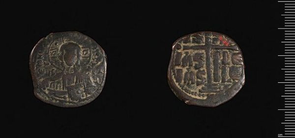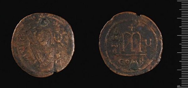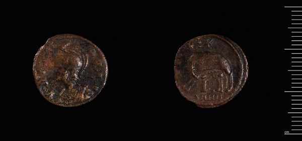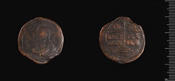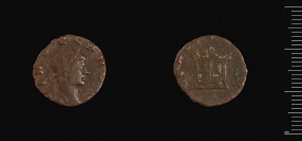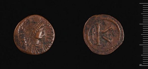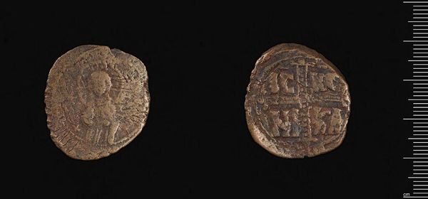 Editor: This is an Anonymous Follis from the Harvard Art Museums. It's a humble coin, heavily worn, yet its materiality speaks of history. What compositional elements stand out to you? Curator: The coin presents a fascinating interplay of form and content. Observe the circular planchet, its circumference disrupted by wear. The central image—a stylized figure on one side, a grid-like structure on the other—creates a compelling tension between figuration and abstraction. Editor: The "grid-like structure" is interesting. What’s your interpretation? Curator: Consider it not just a grid, but a field of repeated units. The arrangement speaks to order and possibly, underlying structure. The varying depths of the incised lines suggest an emphasis on light and shadow, creating a textural surface. Editor: I see what you mean. It's all about the relationships between these formal elements, creating meaning through the coin's structure. Curator: Precisely. The coin invites us to decode its message not through explicit symbolism, but through the inherent qualities of its design.