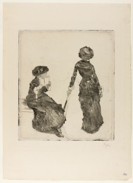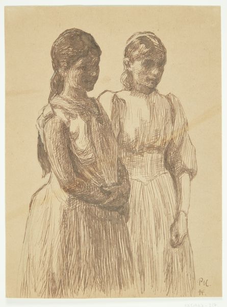 This drawing of 'Two Young Women in Conversation' was made by an anonymous artist with pen and brown ink. Given the clothing and style, it may originate from 17th century Europe, a time when the representation of women was heavily influenced by social and moral codes. The act of conversation in this artwork becomes a focal point, hinting at the importance of social interactions and relationships, especially among women. During this period, women's spaces for interaction and expression were often limited. Was the artist commenting on women’s restricted social roles by focusing on the simple act of conversation? Perhaps. The lack of known provenance makes it difficult to establish the institutional and social contexts in which this artwork was originally created and viewed. To fully understand the cultural implications of this image, further research into the artistic conventions, gender dynamics, and social customs of the time are needed. In doing so, we can shed light on the role of art as a reflection of, or challenge to, prevailing social norms.
