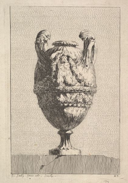 Gabriel Huquier created this engraving of a vase with mermen and a mask in the 18th century. It presents a classic urn form adorned with fantastical creatures and a grotesque mask. Considered within the context of the French decorative arts of the time, the print embodies the Rococo style's love of asymmetry, ornamental flourishes, and references to classical antiquity. The phrase "avec privilege du Roy" indicates royal endorsement and protection, reflecting the institutional support that artists relied upon during this period. The image thus speaks to the complex relationship between artistic creation, royal patronage, and the commercial print market in 18th-century France. By studying period documents such as guild records, royal inventories, and merchants' accounts, we can better understand the social conditions that shaped its production and reception. This approach enables us to interpret the print not merely as a decorative object, but as a cultural artifact reflecting the values and power structures of its time.