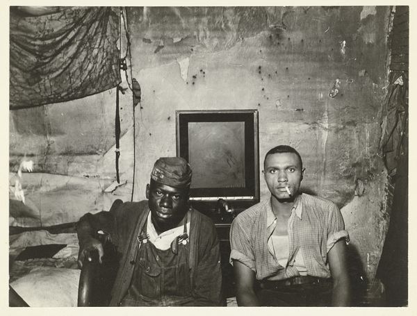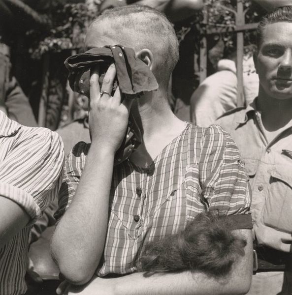 Constance Stuart Larrabee captured this photograph, "Untitled (Collaborators, St. Tropez, France)," using gelatin silver. The composition is stark, focusing on a cluster of figures tightly framed against a textured wall. The tonal range is limited to grayscale, emphasizing the stark contrast between light and shadow. The photograph captures women who collaborated with Nazis during World War II. Their shaved heads and the soldier’s gaze create a tense atmosphere. The tight framing adds to the emotional intensity, compressing the subjects and heightening the viewer's sense of unease. We can read in the photograph a binary relationship between the perpetrator and the victim. But it is the photograph itself that destabilizes this dichotomy. The photograph raises profound questions about justice, retribution, and the lasting scars of war. It is a haunting reminder of the complexities inherent in historical narratives.