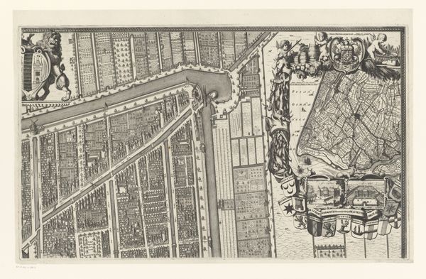 Curator: Here we have an untitled print by Sir Eduardo Paolozzi. The work is held in the Tate Collections. Editor: The density of the city, rendered in monochrome, creates a feeling of overwhelming urban sprawl. Curator: Paolozzi often explored the intersection of technology and urban life. Consider how the bridge, a symbol of connection, is here overwhelmed by traffic, hinting at both progress and alienation. Editor: Yes, and I read that as a critique of capitalist excess and its impact on working-class lives, turning people into mere cogs within an uncaring machine. Curator: Perhaps. Or maybe he's just documenting the formal tensions between organic and inorganic forms within our rapidly changing environment. Editor: It’s a useful reminder of how art can provoke critical conversations about our collective experience. Curator: Indeed, it's a dynamic composition.