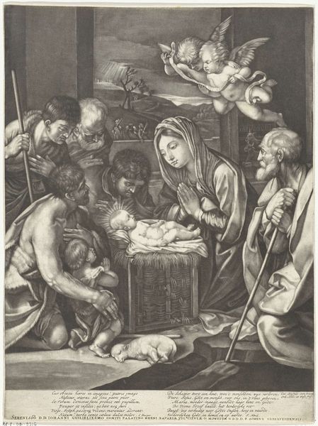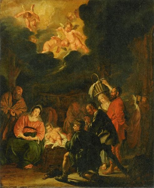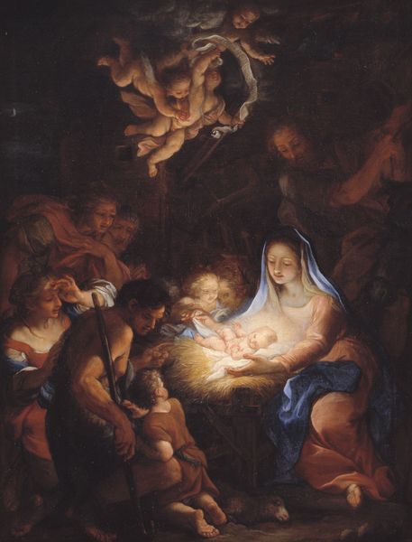 Editor: Here we have Correggio’s “Adoration of the Shepherds,” also known as “The Holy Night,” from around 1530, rendered in oil paint. I’m really struck by the use of light; it's almost theatrical. It's like the entire painting revolves around the infant Jesus as the focal point, with other figures lurking in the shadows. What’s your take on this, viewed through a historical lens? Curator: Correggio’s masterful use of light, specifically his nocturne-like setting, signals a significant shift in the function of religious art during the Renaissance. The painting wasn’t just a depiction; it was intended to evoke a deeply emotional, even mystical experience. The artificial light emanating from the Christ Child challenges artistic conventions and traditional authority. Editor: Artificial light, you say? I was assuming it was divine, rather than artificially depicted light. Curator: Precisely. This painting coincides with rising patronage and competitiveness in the art market; creating uniquely emotional and visually spectacular pieces gave Correggio a competitive edge and brought acclaim and greater power. Where would a piece like this hang? And who would commission such a daring image? Those questions start to unravel the way in which wealth shapes the artistic image in service of self-aggrandizement. Editor: So, it’s as much about Correggio's ambitions as it is about the nativity scene? Curator: Art never exists in a vacuum. The power structures of the time—patronage, religious institutions, social expectations—all influenced its creation and reception. Editor: This has changed my view on the painting significantly. Thanks! Curator: Indeed. Art history encourages us to think critically about the power dynamics behind what we see, who commissioned, who benefitted, who saw the work in its own time.