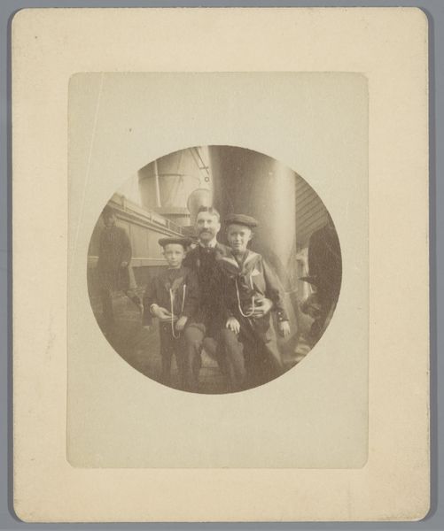 Curator: Good afternoon. Today, we’re looking at a photograph held here at the Rijksmuseum, “Portrait of Four Unknown Children, presumably related to the Marmelstein Family,” captured sometime between 1888 and 1930 by Friedrich Carel Hisgen. It’s rather striking, isn't it? Editor: Haunting, almost. They look like little adults. Stiff and formal, despite their obvious youth. And yet, there's a softness in the rendering that keeps pulling me in. Curator: Absolutely, that's Hisgen’s mastery. Notice how he arranged them. The subtle gradations in their height, seated on those matching benches against the backdrop. A perfect demonstration of balance. Editor: I am getting caught in that background too; what's going on there? I wonder about the trees… sort of like they’re imprisoned by their costumes! Or, I suppose, imprisoned by the family that wants them documented forever in black and white! What an odd moment frozen. Curator: Precisely! The deliberate framing, the strategic use of light and shadow. I love the material qualities here, and also think this points to the rise of portrait photography at the turn of the century, capturing likenesses affordably, democratizing the family portrait. Editor: Affordably, but maybe not accessibly… there's a kind of uniformity here I can't shake; a somber repetition I sense… the artist seems so restrained somehow. But it’s arresting, definitely thought-provoking. A photograph can, in a flash, sum up our attitudes, and then we move on, into a brand-new attitude, hopefully one with sunshine! Curator: Agreed! We're left to ponder those unspoken narratives and formal strategies that make this work resonate so deeply. Editor: Indeed! Each time I see it, I find myself questioning… Are they going to remember me? Which is how art works, if you do it right…