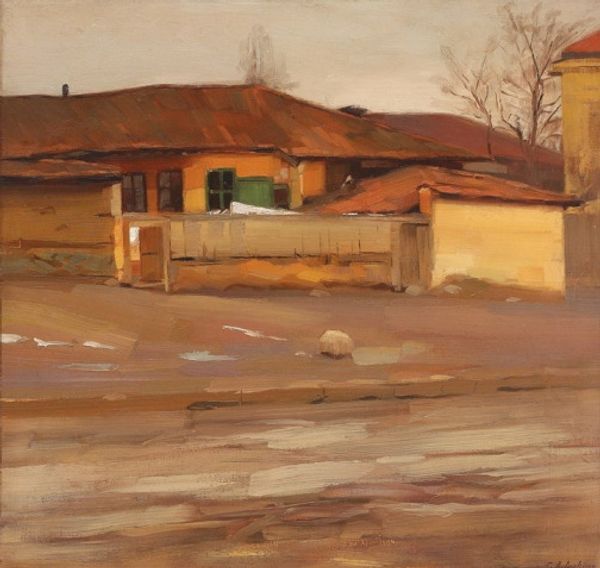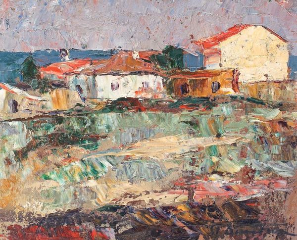 Curator: Stefan Popescu’s “Landscape with Houses,” painted in 1929, offers us a glimpse into a world rendered with simple honesty through the medium of oil paint. What are your initial thoughts? Editor: The earth tones immediately ground me. There’s something so familiar and warm, almost nostalgic, in the way the building settles into the landscape. But it feels almost like a forgotten space. Curator: Absolutely. I get a sense of rural Romania here, perhaps reflecting a time of societal shift. These buildings aren’t grand, but they represent homes, lives lived simply against a backdrop of potential industrial change. Do you sense a similar kind of stillness or solitude? Editor: Yes, the stillness is powerful. It speaks volumes about labor, land ownership, and potentially the peasantry’s position in pre-war Romania. The whiteness of the buildings seems almost defiant against the overwhelming brown and green of the earth. What is he trying to say? What is hidden beneath these muted, everyday tones? Curator: Maybe it's the artist showing what beauty already exists, or an unspoken observation of resilience through simple existence. Think about how revolutionary realism actually can be! To just present life, unadorned, in 1929, right before everything went to hell in Europe... I find it poignant, even beautiful. Editor: I agree—but let's not forget the nuances in depicting the so-called "simple" life. Even in its realism, art can sometimes gloss over complexities. Perhaps the painting is about stillness but perhaps too it is masking something more fraught: class divisions and economic hardships experienced. This calls into play how history views progress and whose stories get lost. Curator: Precisely the beauty of engaging with art. Even in what seems like a simple landscape, these subtle tones, choices, unveil bigger things beneath. Editor: It urges us to pause, doesn’t it? And see what can exist in forgotten space, and it encourages discourse for that matter. Curator: Very much, indeed! It inspires a gentle quietude—an almost humble regard for those small places that define the larger tapestry.