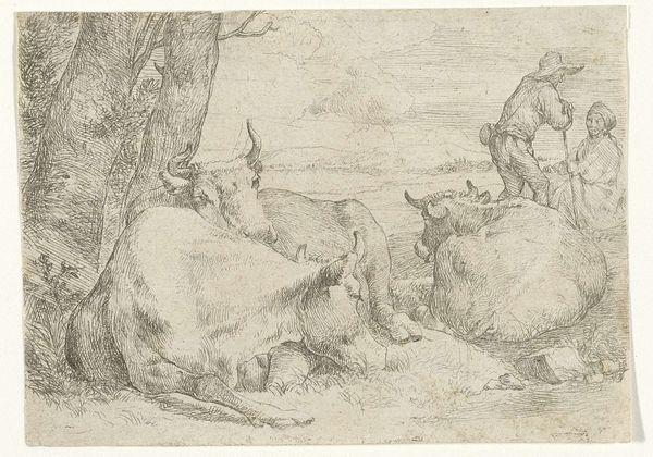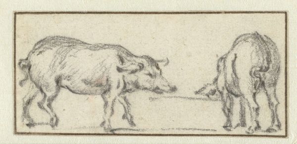 Editor: This is "Two Cows" by Claude Lorrain, a small drawing. It’s so simple, almost like a doodle. What can we learn from it? Curator: Consider the material conditions that made this possible. Paper was becoming more readily available, allowing artists like Lorrain to create studies. These weren't just sketches; they were a form of artistic labor, feeding into the larger production of landscapes and pastoral scenes for consumption by the elite. Editor: So, it's not just cows on paper, but about art as a commodity? Curator: Exactly. The drawing itself is evidence of a changing art market, where even studies held value. Editor: That gives me a lot to think about! Curator: Indeed, seeing art through its production reveals so much.