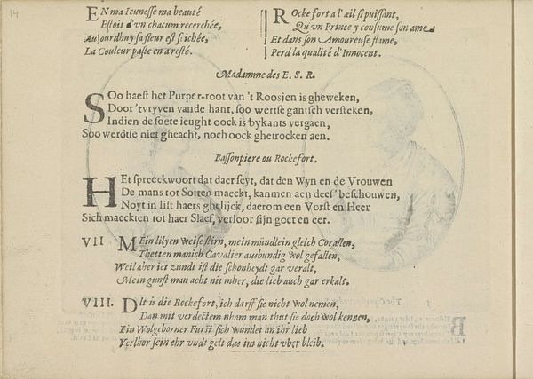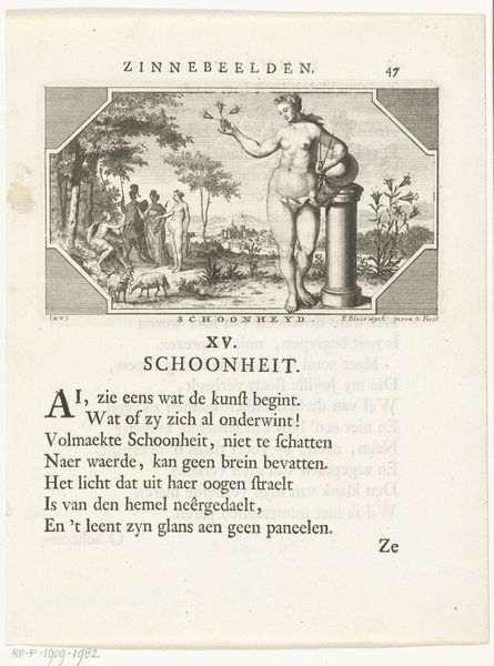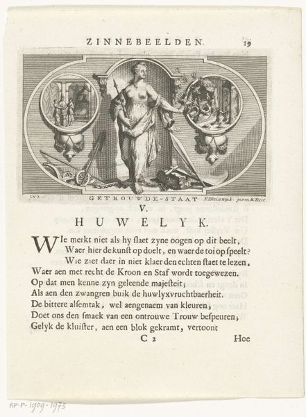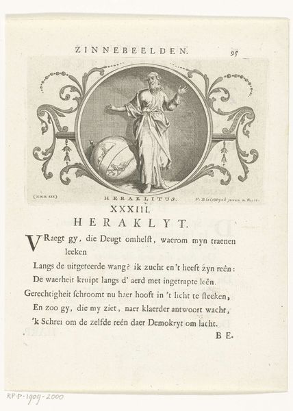 Editor: This engraving, “Embleem met allegorie op wijsheid” or “Emblem with Allegory on Wisdom” by François van Bleyswijck, dating from 1681 to 1737, presents a figure in a circular frame. I’m immediately drawn to the contrast between the dark lines of the engraving and the radiating light emanating from the lamp. What kind of significance would this image have held for viewers at the time it was made? Curator: That light, first, immediately references wisdom, a beacon cutting through the darkness of ignorance. The lamp, prominently held, links to the classical personification of Wisdom, often associated with Minerva, the Roman goddess whose Greek counterpart, Athena, traditionally is depicted with an owl on her shoulder as it also occurs here in the bottom right, another symbolic echo representing knowledge and insightful vision, connecting back to cultural memory and learned societies of that period. Editor: So the lamp and the owl serve as explicit symbols… Were emblems like this intended to carry moral weight or a specific message? Curator: Absolutely. These emblems were enormously popular and served as visual mnemonics, reinforcing cultural values and offering moral guidance. The book in her other hand reinforces that knowledge. It serves as an encouragement to be steadfast, just as it is written below it: "The book, which it exhibits so grandly, that is the book of books". The continuous burning of the lamp becomes a visual representation of knowledge's permanence when fueled by diligent effort. Is there a feeling that this imagery presents itself outside of its time? Editor: No, it feels very much of its time. The overt symbolism and moralizing definitely speak to that era. The way classical imagery is merged with contemporary values is pretty fascinating though! Curator: Exactly! It highlights how societies consistently adapt and re-interpret older symbols to align with contemporary ideologies and aspirations. Editor: It’s been very enlightening (no pun intended!). I'll definitely pay closer attention to recurring symbols in other artworks. Curator: A new way of thinking about the use of symbolism over time should certainly prove to be invaluable as you further explore more and varied art forms.