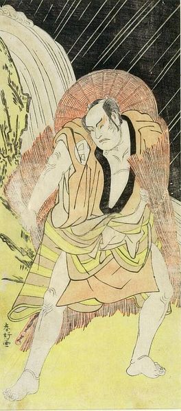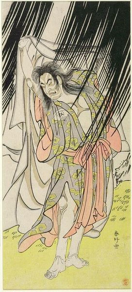 Curator: Ghoulish, isn't it? I'd describe it as unsettling yet strangely beautiful in its anatomical detail. Editor: Indeed, a spectral dance across the woodblock! What we are looking at is "Hyaku monogatari Kohada Koheiji", a print by Katsushika Hokusai. He's more widely known for his landscapes, like "The Great Wave", but here we see him explore the grotesque, working within the Ukiyo-e tradition. Curator: Let’s dissect its composition. We see an apparition—a skeletal figure suspended within this scarlet band, possibly a discarded sash. The flatness, a hallmark of the print medium, strangely enhances the dimensionality of the body, directing our sight towards its gaping eye sockets. The dark ground only reinforces the subject. Editor: Context is critical, though. Japanese ghost stories, or "kaidan," served as moral lessons often targeting the injustices of the era. It speaks to broader cultural anxieties, wouldn’t you agree? We also can’t look at this and ignore gender; spectral vengeance enacted upon wicked spouses—we have to read into Koheiji's presence as a call-out of patriarchal dominance and abusive relations. Curator: Ah, yes. But consider Hokusai’s deliberate application of color, especially the contrast between the pallid flesh and the crimson band. This generates an undeniable visual tension, playing with attraction and revulsion. The sash has its polka dots equally distanced as an ode to geometrical rigor. Editor: While formal analysis is undoubtedly valuable, reducing the image to mere geometry dismisses its potential as an accusation, doesn’t it? Can’t we suggest it operates on many levels? The ghostly hand clinging to the fabric seems to reflect a moment of profound loss, too. It can also symbolize precarity or dependence on exploitative social conditions, don’t you think? Curator: Perhaps both elements are intertwined; this emotional resonance arises directly from the graphic power that stems from line, color and shape, allowing for endless possibilities in the reception. The graphic power, I think, does wonders in a tale of spousal abuse and death. Editor: Undoubtedly, contemplating Hokusai’s Koheiji reminds us of the ever-evolving dynamics between formal construction and contextual interpretation in understanding the breadth of socio-historical anxieties expressed in Japanese art. Curator: I couldn’t agree more. It is always rewarding to explore the way structural elements, particularly their composition, influence the narratives and contexts around these iconic visuals.