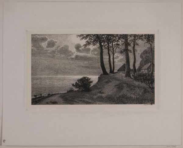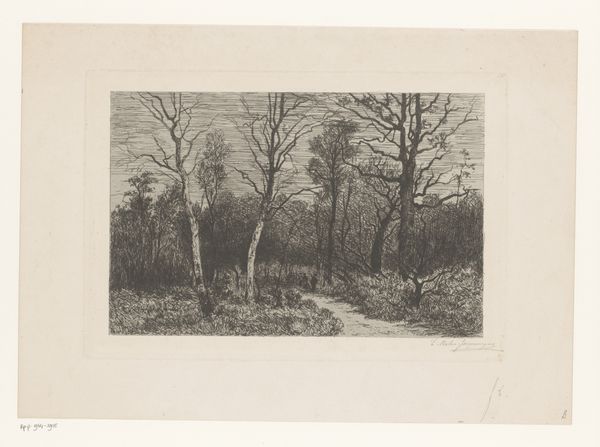 Editor: Here we have "Illustration til 'Snap', fortælling af H. Drachmann," made by an anonymous artist between 1870 and 1874. It's a print, an engraving showing a figure entering a dark, wooded landscape. It feels… ominous, almost like the start of a dark fairy tale. How do you interpret this work? Curator: That's a great observation! It certainly carries that weight. To me, this evokes the complex relationship between humanity and nature that defined much of Romanticism, but also the specific nationalistic anxieties of the period. Given that it illustrates a story by Drachmann, a figure known for his politically charged literature, we must consider this image in relation to themes of national identity and social change. Editor: How so? I hadn’t thought of that connection. Curator: Think of the period, the late 19th century. Many nations were grappling with defining themselves, particularly in the face of industrialization and political upheaval. Drachmann often explored the tension between rural tradition and modern progress. Do you see how this seemingly simple landscape might, in that context, represent something larger? Perhaps the uncertain path forward for a nation struggling to hold onto its past? Editor: So, the forest isn't just a forest, but a metaphor for the unknown future? Curator: Precisely. And the solitary figure could be interpreted as an individual, or perhaps even Denmark itself, tentatively stepping into that future. Consider the lack of detail, the ambiguity – does it feel more like a hopeful journey or a hesitant retreat? Editor: I think I see it differently now, not just an ominous landscape but a symbolic journey into national identity during a time of change. Curator: Absolutely! Context truly shapes the experience. Hopefully, this will guide everyone toward similar discoveries when approaching other works from the era!