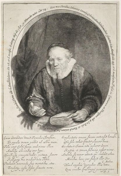 Editor: This is Francesco Novelli's "Jan Cornelis Sylvius," a small etching housed at Harvard. It feels so intimate, almost like a private glimpse. What strikes you most about this portrait? Curator: I see a powerful statement about representation and power. Sylvius, a religious figure, is rendered with striking realism, but who is granted the power to represent him, and what biases are at play? Editor: The artist? Curator: Yes, but Novelli is working within specific social and artistic conventions. Consider the male gaze, the power dynamics inherent in portraiture, and how these might shape our understanding of Sylvius. Editor: So, it's not just about capturing a likeness, but about the social and political context of that capture? Curator: Precisely. It invites us to question the narratives embedded within visual representation and to consider whose voices are amplified and whose are silenced. I find that fascinating. Editor: I see the portrait in a new light now, as an intentional work within an historical context.