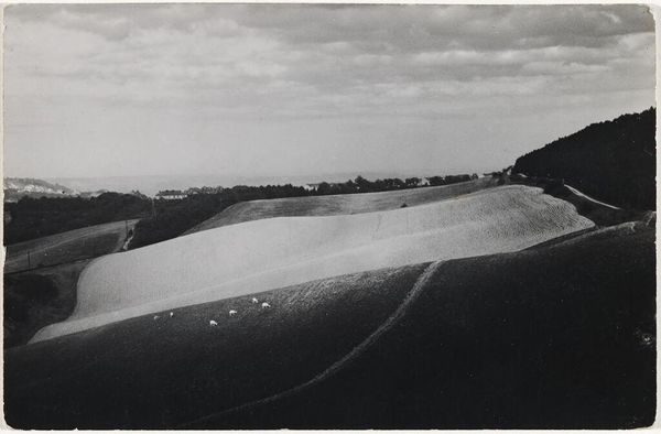 Editor: This photograph, “Nederland gezien vanuit een Duits vliegtuig,” or "The Netherlands as Seen from a German Airplane," dates possibly from 1940 to 1945, and the photographer is unknown. The perspective is really striking – we're clearly looking down on the Dutch landscape from an aircraft, with what appears to be the wing of the plane cutting diagonally across the frame. It's such a fascinating document, tinged with a bit of unease given the context. What strikes you most about it? Curator: That unease is exactly right. Consider the public role of images like this during wartime. Aerial photography became a tool for surveillance and control. This image, seemingly benign, embodies the power dynamic of occupation. It presents the Netherlands as seen through the eyes, literally, of the occupying force. Does the image aestheticize the landscape, rendering it merely a strategic asset? Editor: That’s a chilling thought. I hadn't considered the image as a form of control. The neat, orderly fields suddenly seem less pastoral and more like a grid, a map under surveillance. Does the photographic technique itself contribute to this feeling? Curator: Absolutely. The high angle flattens the landscape, emphasizing the imposed order. Think about who controlled the dissemination of images like these. What message were they intended to convey, both to the occupiers and the occupied? Editor: So it’s less about the beauty of the landscape and more about the power of the viewpoint. It really changes how I see the photograph. I had just thought about the aesthetic. Curator: Precisely! Considering the socio-political forces at play transforms our understanding. Now you can see beyond the surface and analyze the layers of meaning embedded within. Editor: I learned to think more deeply about art's role in conveying social messages. This wasn't just a landscape photo; it's a reflection of a specific, very fraught time and point of view.