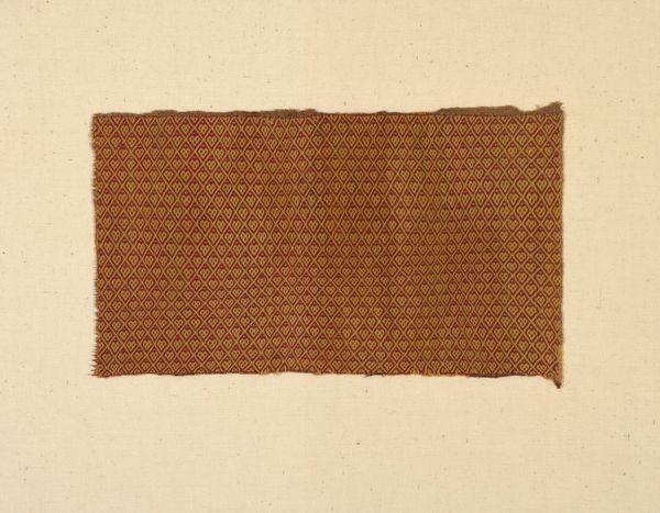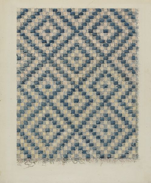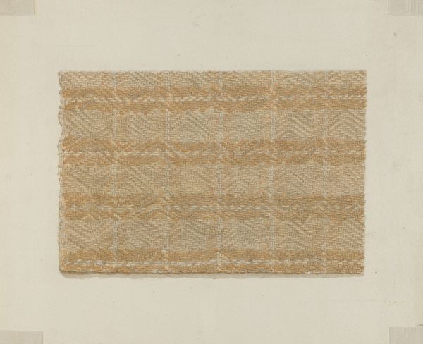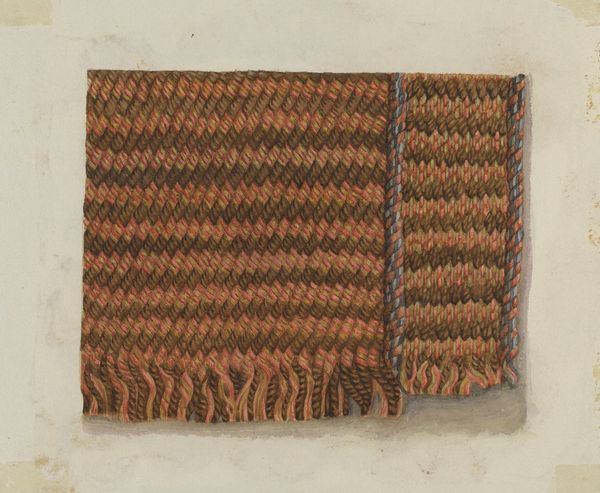 Editor: Today we are looking at “Section of Mat”, made around 1935 by Mary Berner. It appears to be colored pencil and maybe watercolor on paper, depicting exactly what the title says: a section of a woven mat. The texture is what grabs me first – all those tiny, carefully rendered lines. It feels so tactile, almost begging to be touched. What strikes you about this drawing? Curator: Well, isn't it interesting how such a seemingly simple subject, a fragment of a mat, can hold so much? It’s as if Berner isn’t just showing us a physical object, but also inviting us to contemplate the labor, the time, and the quiet dedication embedded in the craft itself. Notice how she hasn’t chosen some grand landscape or dramatic portrait, but something utterly domestic and familiar. Do you think there’s a statement being made here about the value of the everyday? Editor: I can see that. Elevating the ordinary... It definitely shifts my perspective. The repeated pattern also makes me think about the industrial design or modernism – but something handmade feels so opposite. Is that tension intentional, do you think? Curator: I'm sure of it. Berner presents you with something meticulously hand-rendered that mimics a mass-produced pattern, disrupting our easy understanding. This isn't just replication; she’s deeply internalizing the essence of the design, meditating on the interplay between art and craft, the handmade and the machine-made. It is like a love letter to textiles, with abstraction softly expressed through the warmth of color. Don't you think? Editor: Definitely. It's making me consider all the hidden artistic intention that goes into so many designs that get overlooked! This was enlightening – I'm so glad we took a closer look. Curator: Likewise, that's the great thing about art; it keeps inviting you into deeper appreciation for beauty, especially in the simplest things.