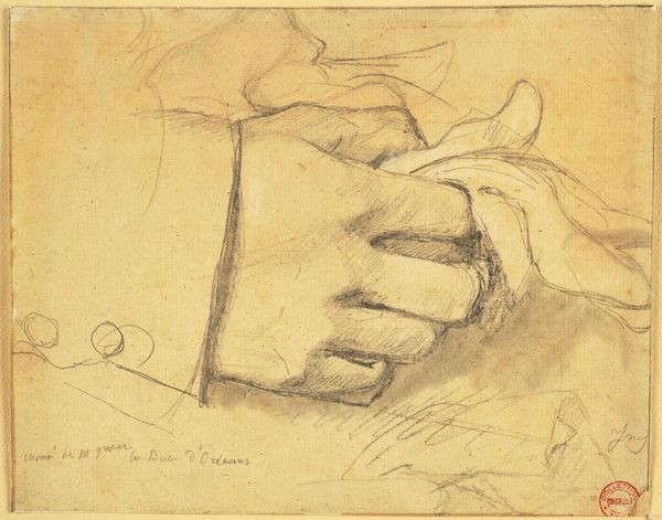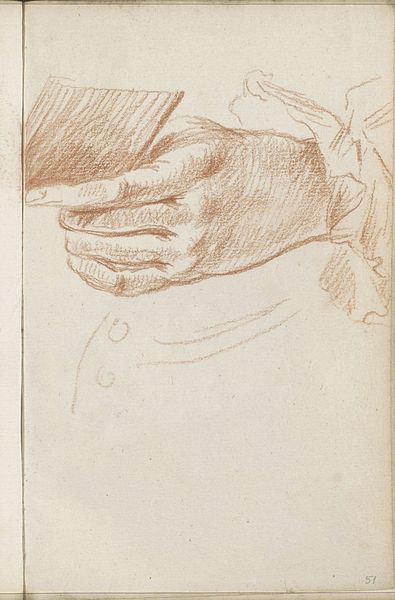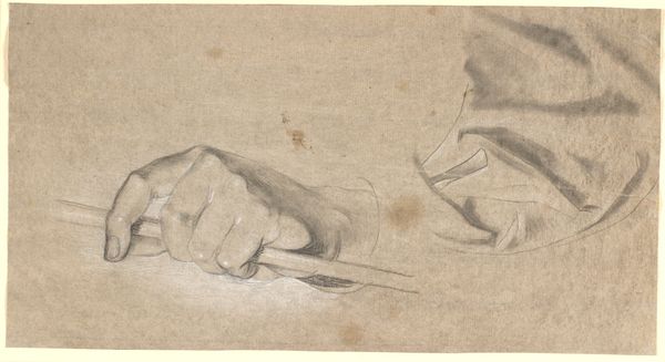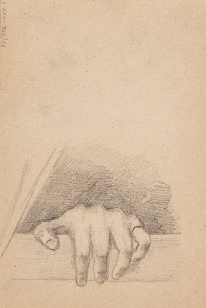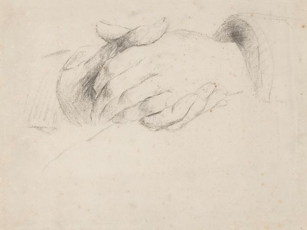 Editor: This is Jan Veth’s "Studie van de rechterhand van Geheimrat M. Kempner," or "Study of the Right Hand of Geheimrat M. Kempner," made sometime between 1874 and 1925. It’s a pencil and graphite drawing, currently housed in the Rijksmuseum. I’m struck by the artist's attention to capturing the hand's three-dimensional form, almost sculptural in its effect. What aspects of its visual construction do you find most compelling? Curator: I appreciate your observations regarding the sculptural quality. Note the subtle gradations in tone, achieved through delicate hatching and cross-hatching. These tonal variations describe the form and volume with remarkable precision. Consider how the artist directs the viewer’s gaze through these variations in shading and the confident use of line. Where does your eye settle first? Editor: Initially, my eye is drawn to the knuckles due to the stronger definition, but then my attention shifts to the sleeve and the fabric folds. It seems like the study goes beyond simply recording anatomy. Is that a fair observation? Curator: Indeed. Veth manipulates the medium to exploit the intrinsic qualities of line and tone to suggest not only form but also texture, adding another layer to its complexity. Observe the deliberate arrangement of the lines that render the fabric. Editor: I see. So, the value lies in how these elements combine to create a visually engaging composition rather than any inherent narrative or symbolic meaning. Curator: Precisely. Veth uses line and shading to transcend representation and arrive at an almost abstract interplay of form. The close cropping focuses attention solely on the hand, removing any distractions, thereby encouraging a deeper reading of its structure. It reveals the very essence of the artist’s observational process. Editor: This new awareness of Veth's process transforms my initial understanding of the work, revealing a deliberate construction behind this study of form. Thanks for the insightful perspective! Curator: A keen eye on your part as well.