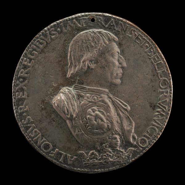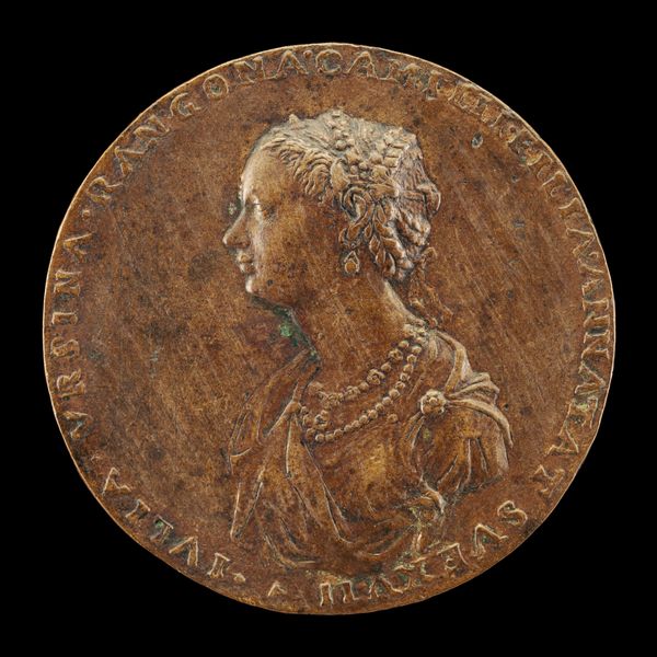 Editor: This is a bronze medal from 1558 depicting Alessandro Farnese, created by Gianpaolo Poggini. It’s striking how the artist captured such detail on a small, round surface. What stands out to you when you look at this piece? Curator: The work offers a study in controlled relief. Note how Poggini manipulates the surface to suggest depth. The subtle variations in height and the meticulous detailing, particularly around the facial features and the clothing, establish the young Farnese’s presence and status. Editor: So, you're drawn to how the artist used the metal to create dimension and hierarchy. I'm interested in how this is "read." Can the medal itself act as a form of symbolism? Curator: Indeed. The circular format reinforces the idea of completeness and perfection, qualities often associated with rulers. Consider also the inscription that frames the portrait; how it guides the eye and simultaneously exalts the figure at the medal's center. Editor: It's interesting to think about how the shape and text contribute to the overall message, almost like framing a narrative. So what about the lines? Curator: Note the repeated circular lines that function as a geometric metaphor for eternal legacy. Consider how light would play across the surfaces of this bronze work, each angle highlighting the contours to further emphasize three-dimensionality. This reinforces a symbolic elevation. Editor: I hadn't considered how light would affect the medal! Thinking about the craftsmanship and symbolic construction gives me a richer understanding of Renaissance portraiture. Curator: Observing these elements can illuminate our understanding not only of the artwork itself but also the values and systems within which it was created.