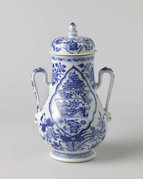 Curator: Here we have a cruet set crafted between 1720 and 1735 by De Drie Posteleyne Astonne. The earthenware piece features a captivating blue and white decorative scheme. Editor: It's whimsical! The flowing patterns create a sense of joyful movement despite the static medium. And those little dragons… mischievous, almost. Curator: Indeed. Consider the social context: Dutch Delftware at this time was incredibly popular and often emulated Chinese porcelain. This piece speaks to the growing middle class's desire for refined domestic goods. Editor: It’s fascinating how this desire manifested itself in such intricate, almost maximalist patterns. Floral motifs, dragons… It really blurs the line between functionality and decoration. What does this aspiration towards the upper class reveal about societal values at the time? The gendered role in domesticity and the display of such items? Curator: Precisely. The imagery reflects the influence of global trade and the desire to possess exotic aesthetics. It also highlights the Dutch Republic's prominent role in the international market and their attempts to establish cultural dominance through production. Editor: So this wasn’t just a pretty set of containers for oil and vinegar; it was a statement. Owning something like this communicated taste, awareness of global trends, and, ultimately, wealth and power. I wonder how accessible these cruet sets were beyond the affluent merchant class? Curator: They were relatively accessible but still denoted a degree of financial comfort. Think about how this decorative style became ubiquitous through various forms, extending even to clothing prints. Editor: I’m looking at the craftsmanship, the repetitive motifs—how does the factory-made component interplay with artistry and social standing? How do those forms of craftsmanship compete to this day in social and economic structures? Curator: Excellent point, considering the era’s transition towards more industrial production. Its delicate details contrast this movement towards factory style design and reflect broader shifts within class dynamics. Editor: Food for thought, pun intended. Curator: Indeed. A compelling demonstration of how even seemingly mundane objects can embody complex social and historical narratives.