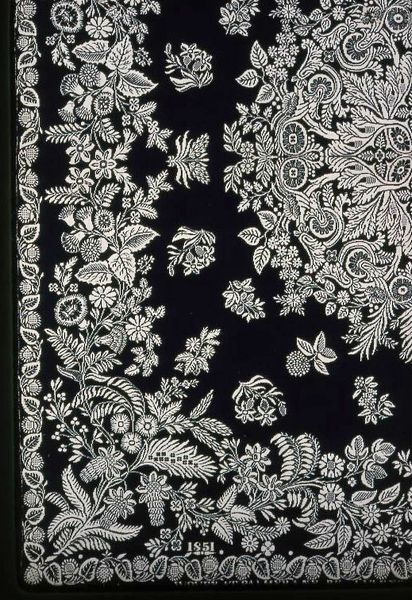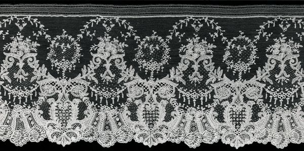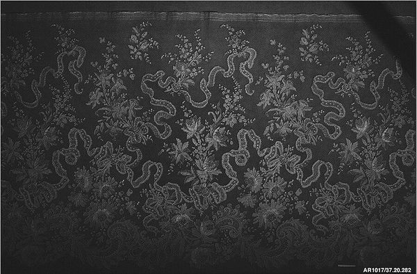 This delicate lace flounce was created by Georges Martin of the Compagnie des Indes, sometime in the 19th century. Intricate floral patterns and sinuous ribbons create a field of symbolic representation. Consider the image of the ribbon, a motif stretching back to antiquity. Originally a simple band used to bind and connect, it evolved into a symbol of status, adorning religious figures and the nobility in paintings throughout the ages. Here, its presence interwoven with blooming flowers speaks to themes of nature and elegance. One can trace a similar evolution of the floral motif in art, from early symbolic uses in religious iconography to representations of earthly paradise. These recurring motifs, passed down through history, trigger something primal in the viewer, stirring collective memories of celebration and renewal. They are powerful forces, engaging viewers on a deep, subconscious level. The ribbon and flower dance, an eternal recurrence—reshaping, resurfacing, and gathering new meanings.