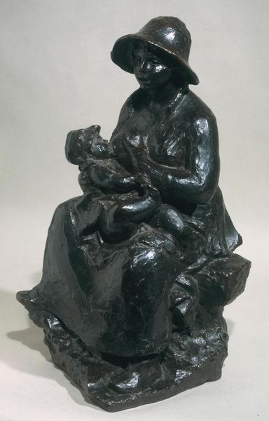 Editor: Here we have Aimé-Jules Dalou's bronze sculpture, "Charity or Maternity," created between 1872 and 1899. I'm struck by the implied movement, almost like the figures are emerging from the raw material itself. How do you interpret this work? Curator: Well, observing strictly the formal elements, we see a complex interplay of textures and volumes. Note how Dalou manipulates the bronze surface to create a contrast between smooth, polished areas and rough, unworked sections. Where does this contrast lead us? Editor: I guess the smoothness emphasizes the mother's figure, maybe her nurturing role? Curator: Precisely! The smooth contours highlight the idealized form of the mother and the vulnerable children. However, what of the swirling, almost chaotic base? Its lack of detail almost obscures the subject matter. Does that inform the sculpture? Editor: It makes me think of raw, natural forces, somehow connecting maternity to something powerful and untamed. It definitely shifts away from idealization of women! Curator: Excellent point. That contrast prevents us from considering it pure sentimentality. Further, the work’s lack of clean lines actually accentuates a realism--but of course one conveyed by how Dalou renders light and shadow across that intentionally rough surface. It is in these oppositions that its tension—its beauty—lies. Editor: This was incredibly insightful; thank you for highlighting the opposing elements, I hadn't seen it that way. Curator: And I, in turn, benefited from considering your sensitivity to movement and raw material. I encourage us all to look more carefully, decode the language that the materials themselves possess.