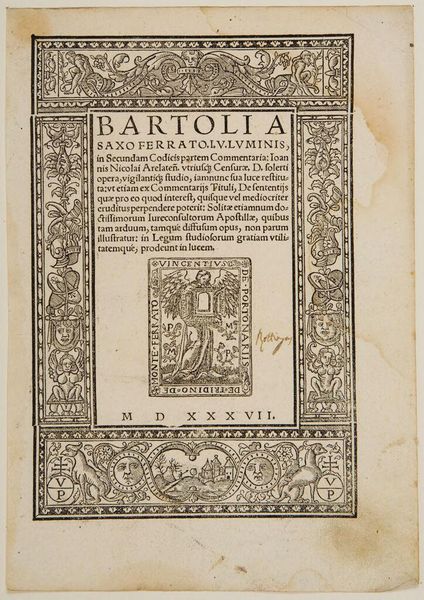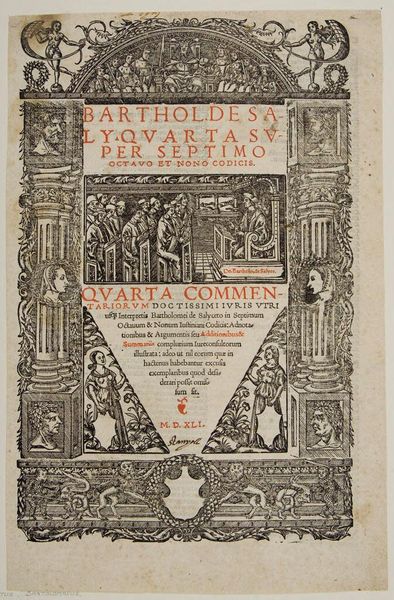 Curator: This is the title page from "Alfonso IX, la Quarta Partida," printed anonymously in Lyon, France, in 1550. Editor: It’s a whirlwind! The page feels so densely packed, a real feast for the eyes with its intricate linework. Curator: Indeed. Notice the balanced framing; classical figures alternate with heraldic emblems, each contained within its own compartment. The letterforms themselves possess a certain rigidity, reflecting the structuralism of the time. Editor: The symbolism is everywhere! The figures likely represent virtues or classical deities, and the heraldic elements speak to lineage and authority. Look at the bottom inscription "QVAESITOR MINOS VANAM MOVET"—that touches on justice and judgement. Curator: The relationships between the text, the emblems, and the figures creates a complex visual language, a hierarchy of meaning. The composition directs the eye systematically. Editor: It speaks of a desire to impose order on the world. All these images are like memories, resurfacing across centuries. Curator: A fascinating example of graphic design serving both functional and symbolic purposes, wouldn't you agree? Editor: Absolutely. It’s a reminder of how much images can carry, even across vast stretches of time.