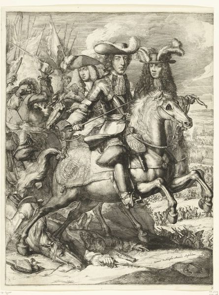 Adriaen Schoonebeek created this portrait of Emperor Leopold I, in what appears to be an etching, a printmaking technique that uses acid to corrode the uncovered parts of a metal plate to create a design. Dominating the composition is the figure of Leopold I, mounted on horseback, presented in a classical pose reminiscent of ancient equestrian statues. The artist pays particular attention to line and detail, capturing the texture of the emperor’s elaborate garments and the musculature of the horse. This use of line contributes to the overall grandeur and authority of the portrait. The underlying structure reveals much about the cultural codes of power and representation during that time, using semiotics to convey Leopold's authority. The positioning of the horse, trampling over vanquished foes, serves not only as a symbol of military strength, but also destabilizes any narrative of peace or diplomacy. By examining the formal qualities of the print—the lines, the arrangement of figures—we gain insight into how art functions within a larger discourse of power and legacy.