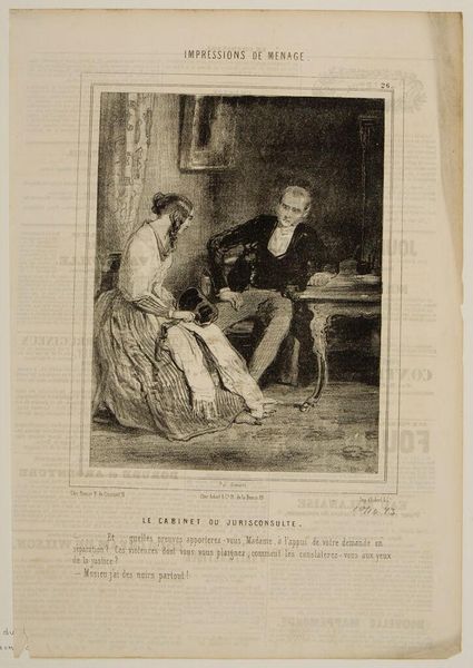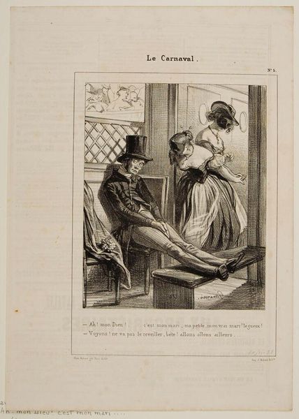 Curator: Paul Gavarni, born in 1804, created this piece entitled, "Pardon, beautiful lady . . .". The precise date of its making is unknown. Editor: The bowing gentleman immediately strikes me. His posture is quite dejected, almost comically so, yet the delicacy of the lines suggests a more nuanced emotional state. Curator: The lithographic process allowed for relatively quick reproduction and distribution, contributing to the rise of visual culture and consumerism. Gavarni produced illustrations and commentary on contemporary Parisian life, exploring social issues. Editor: The bowing figure is fascinating. It's like a symbolic posture of supplication, perhaps suggesting themes of class disparity, or the power dynamics between men and women in 19th century Parisian society. Curator: Indeed. The materials themselves – the paper, the ink, the printing press – enabled Gavarni to reach a wide audience with his social commentary, potentially influencing public opinion. Editor: It also could be interpreted as a broader statement about societal constraints and gender roles. The image carries a weight of unfulfilled desires, or perhaps even regret. Curator: Considering the piece was likely printed in a newspaper, its durability as material is less important than its ability to convey ideas about everyday life during the era. Editor: Absolutely. It makes you ponder the weight of societal expectations on individual lives, even now.