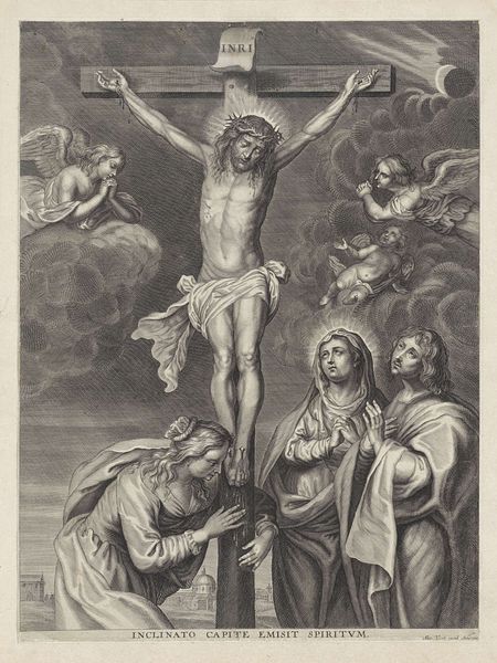 Curator: This is Gérard Edelinck's "Crucifixion," housed here at the Harvard Art Museums. Look at how the angels surround the figure of Christ. Editor: There's a swirling theatricality to this print. It feels like a stage production, full of dramatic gestures of grief. Curator: Yes, and the light draws your eye to the central figure, highlighting the wounds. The artist uses the symbols of the crucifixion powerfully here. We have the crown of thorns, the placard, even the discarded crown below. Editor: The crown’s placement on the pillow is a compelling visual statement about power, sacrifice, and divine authority. I wonder about the audience for such images and how it reinforced social hierarchies. Curator: The image also reflects a deep cultural memory. The crucifixion as a symbol of suffering and redemption has resonated through centuries of art and belief. Editor: Indeed, its historical weight continues to shape discussions around faith, justice, and power today. It's a potent reminder. Curator: Seeing the symbol through these new lenses gives this artwork new dimensions. Editor: Absolutely. It reminds us of the importance of engaging with art through multiple perspectives.