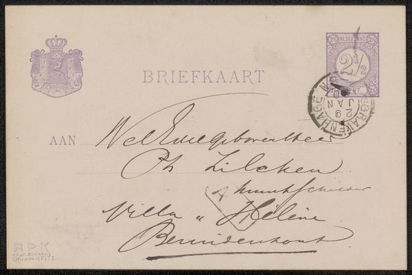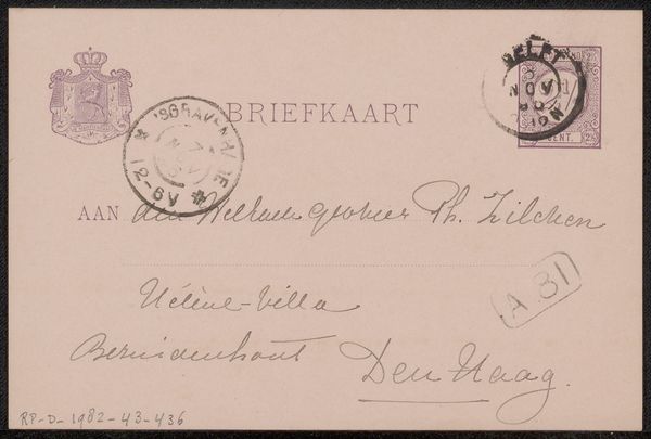 Curator: Oh, look, it's a window into a different time! This is a "Briefkaart aan Philip Zilcken," possibly from 1894, a simple postcard rendered in pen and ink. Editor: There's something hauntingly delicate about it, like catching a faded memory on paper. The pale pink of the card, the elegant handwriting…it all whispers of another era. I can almost smell old paper. Curator: It's intriguing, isn't it? Given that André Jolles created it, likely as a quick sketch. Jolles’ handwriting tells its own story; a flowing script addressed to someone who is referred to as ‘Kunstschilder’, or ‘Artist’ in English. We see postmarks of Amsterdam and another place called Braderma on the lower-left-hand side. It is now part of the Rijksmuseum's collection. Editor: Definitely captures the essence of a late 19th century correspondence – almost like holding someone's secret thoughts, their day-to-day thoughts. And those official stamps—they’re so formal, contrasting beautifully with the informal script. There's a quiet dignity in it. Curator: And think about the materiality—the deliberate strokes of the pen on paper. Today, everything's digital and fleeting. But these kinds of artworks, in ink on paper, meant the artist was very conscious of how to control pressure for darks, lights, textures etc. It would demand practice, skill and experience! Editor: Absolutely. It speaks of connection in an age without instant communication. Sending thoughts across a distance – putting feeling into the hand that presses a pen against the page. Do you wonder if Philip Zilcken valued getting his postcards at the time? Or if Jolles had no sense of the cultural worth of the correspondence? We'll never know. Curator: A poignant thought. This little postcard offers a fleeting glimpse into the relationship of both persons – which is now etched in history. We will hopefully never know that about ourselves in years to come! Editor: Indeed. A simple card, yet overflowing with understated grace. I leave this now more contemplative and with a feeling of intimate communication with the ghosts of the past.