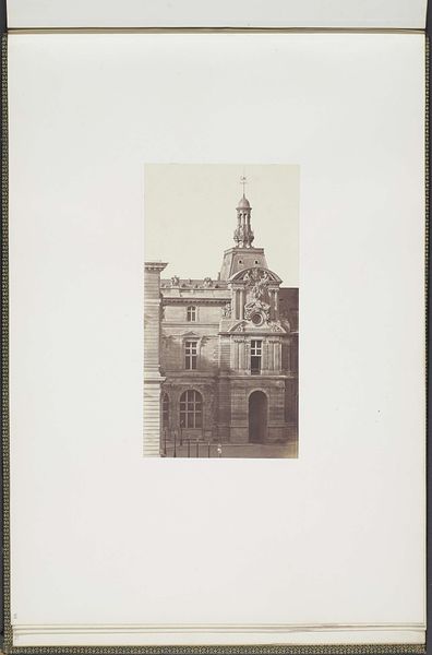 Editor: Here we have a photograph titled "Gipsmodel voor een versiering op het Palais du Louvre door Jean-Pierre Hurpin en Marie Etienne Cousseau," created around 1855-1857. It depicts a plaster model. The sepia tone gives it a sort of antiquated, bureaucratic feel. What stands out to you about this piece? Curator: I'm struck by how this photograph invites us to consider the relationship between art, power, and labor in 19th-century France. It's not just a simple documentation of a plaster model; it speaks to the vast, often unseen, network of artisans involved in the construction and embellishment of iconic symbols of state power, like the Louvre. How were sculptors Hurpin and Cousseau implicated in the visual language of empire and authority? Editor: That's interesting, I was really just thinking of it as a record of a sculpture! How do we unpack that implication? Curator: Well, think about neoclassicism, the dominant style at the time. It draws heavily from ancient Greece and Rome, associating the French state with those historical empires and their supposedly "natural" right to rule. Also, this photograph, presented almost as an archival document, enforces a certain official narrative and begs the question, whose stories and labor are deemed worthy of preservation and recognition? What social hierarchies are embedded within the very act of photographing and archiving? Editor: So, seeing it as more than just a photo reveals those hidden layers of meaning. Curator: Precisely! It allows us to question the supposed neutrality of art and recognize its active role in shaping perceptions of power and social order, then and now. It also speaks to how collaborative art can be and still overlook those that contribute to it. Editor: This has given me a lot to consider regarding what it meant to work on art back then. Curator: Exactly, and thinking intersectionally enables us to look at any artwork in a new way!