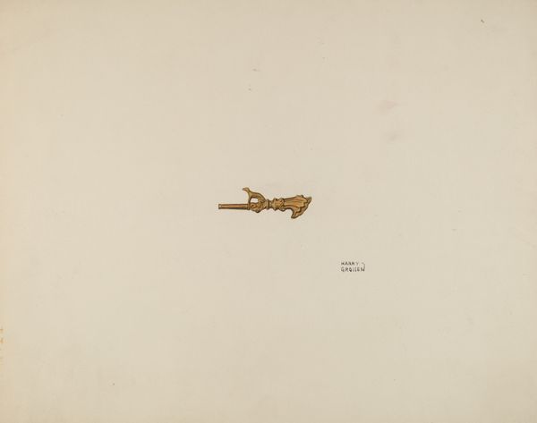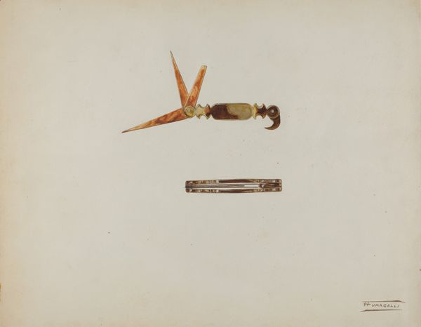 Curator: Welcome. We are looking at "Spring Lancet" created around 1940 by Joseph Cannella. It’s a graphite, pencil, and watercolor drawing on paper. Editor: Hmm, the precision of the drawing is kind of striking! It feels cold, almost clinical. You'd think with watercolor it would feel softer, but there's a metallic glint that overrides any natural feel. I wonder what it was used for... It looks medieval but maybe not. Curator: Yes, that clinical feeling is interesting given the socio-political context. Cannella created this during a period when industrial advancements were both celebrated and feared. Medical tools like this often symbolized progress but also anxieties surrounding dehumanization in the face of technology. Editor: Dehumanization makes sense. Even the colors, the bronzes and browns, give it that "old machine" feel—like something plucked from a forgotten corner of an inventor's workshop, ready to... dissect something. Or perhaps examine more like. What does the name "Spring Lancet" evoke for you? For me, there is something about "spring" as new, a period of hope and birth and the use of "lancet", is violent, like rebirth but causing pain? Curator: That's a compelling interpretation. It speaks to the dual nature of medical intervention, doesn’t it? Lancets are traditionally associated with bloodletting, a practice that evolved dramatically throughout the history of medicine, surrounded in its time with beliefs about how best to heal people. Combining this idea with "spring," Cannella is perhaps commenting on society's eagerness to embrace new methods, despite their potential invasiveness, and how technology will always push and force something new to blossom. Editor: Right. I feel that it is neither praising nor condemning the object. It's rendered in such exquisite detail that it suggests admiration or maybe even a love of machinery. I am more unsettled the more I look. There is a strange beauty in seeing the familiar rendered alien. Curator: That feeling is a testament to Cannella's technical skill, but also the power of the image. It invites contemplation on how innovation impacts how we understand and interact with our world. Thank you for your time and reflections on Cannella's "Spring Lancet." Editor: It has been a great way to look at this small thing as both ordinary and strange, brutal but maybe... useful. Thanks for joining me!