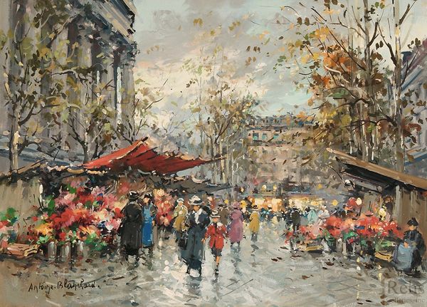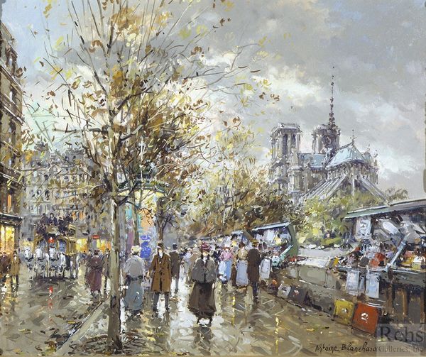 Editor: Here we have Edouard Cortes' "Bouquinistes", an oil painting capturing a Parisian street scene, probably created en plein air. The palette feels muted, autumnal... making me feel a bit melancholy, yet drawn in. What strikes you most when you look at it? Curator: Melancholy, yes, I feel that too. It’s funny, isn't it, how a painting can almost... hum a particular mood. For me, it's the light. See how it reflects off the wet pavement? Cortes masterfully uses that reflected light to illuminate the scene, making the everyday feel almost magical. It reminds me of a slightly blurry memory. What do you think of the way Cortes depicts the people? Editor: They seem less detailed, almost like smudges of color that gives a sense of movement... very Impressionistic! Like they're part of the atmosphere more than distinct individuals. Curator: Exactly! It’s less about specific portraits and more about capturing the general vibe, the *feeling* of being there on that particular day. Like a snapshot of a moment, of fleeting Parisian life near the Seine and Notre Dame, where booksellers display their wares. Do you get a sense of a specific era looking at this work? Editor: I do. Maybe the late 19th or early 20th century, before everything became so digitized? It’s nostalgic, romantic almost. Curator: Precisely. Cortes was the master of light of Parisian streets. Makes me want to curl up with a worn book and a steaming mug of something warm, listening to the rain. Editor: I agree. I learned so much from Cortes' street scenes. I can't believe how it seems like he invented light with his impressionistic point of view.