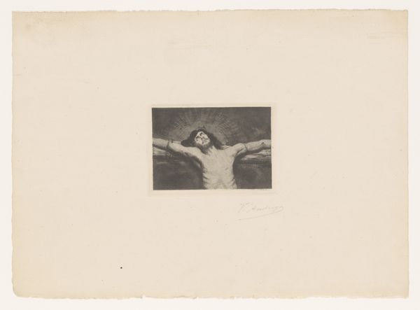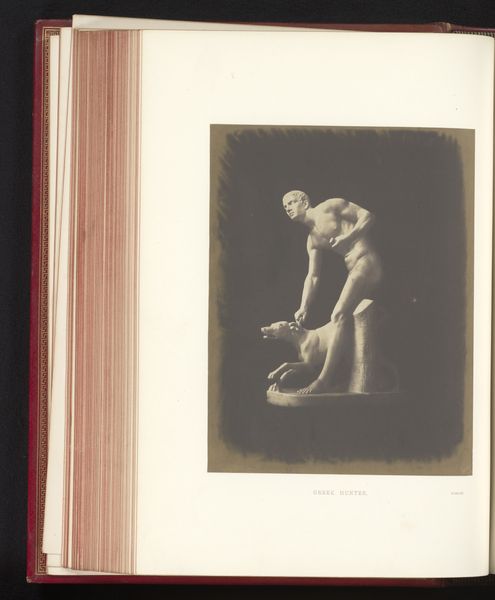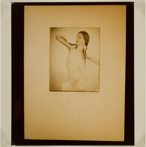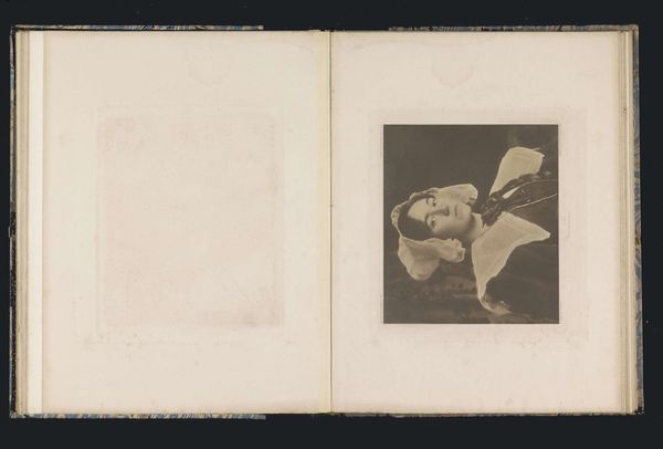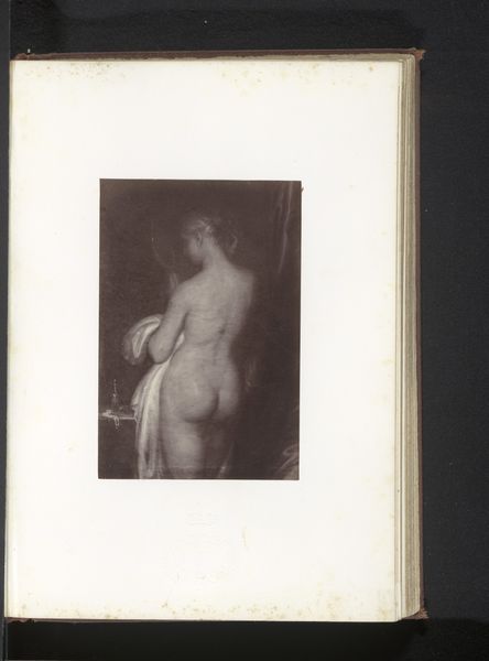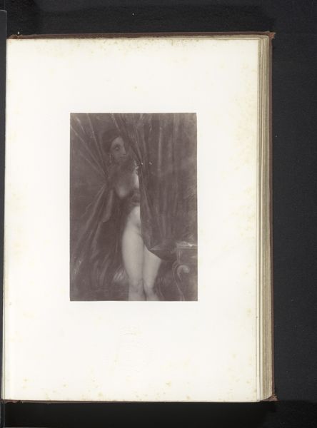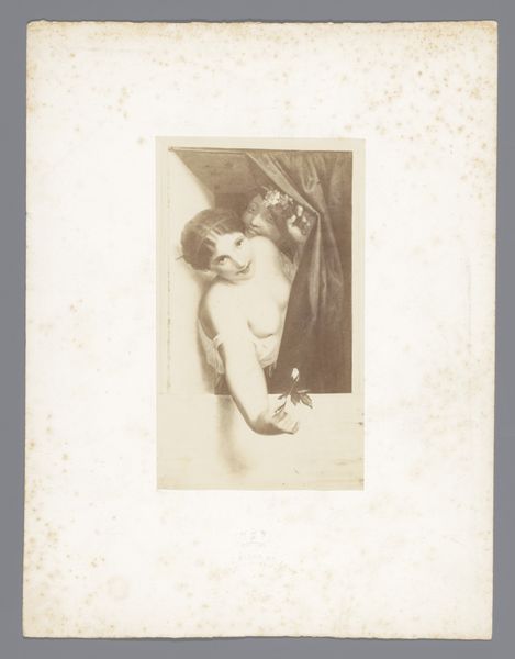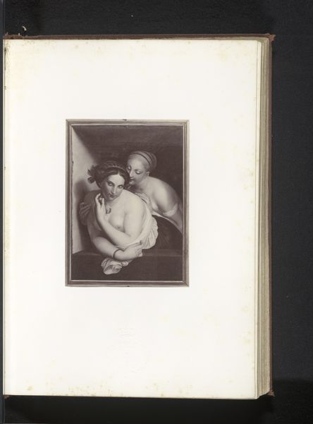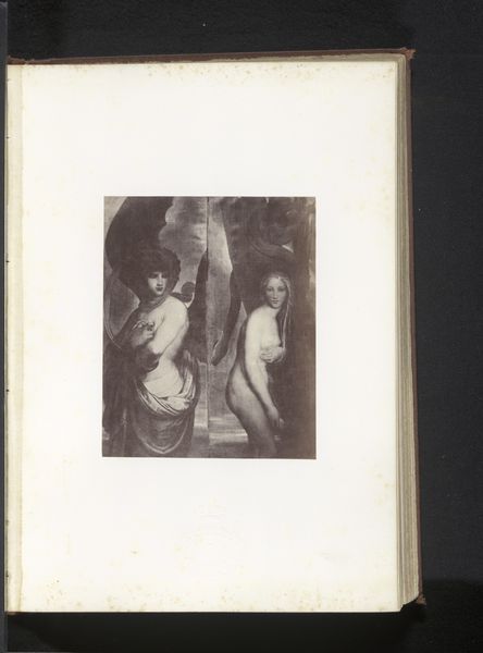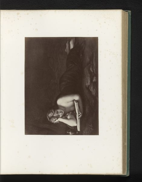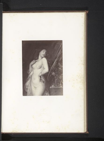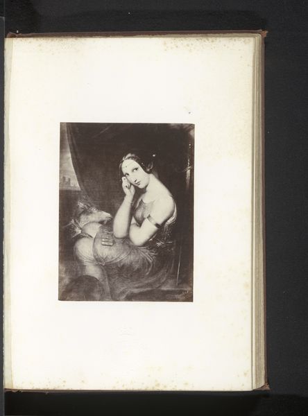 Curator: What a find. We're looking at a photograph of Antoine Wiertz's painting, "The Rosebud", reproduced sometime before 1868, as photographed by Edmond Fierlants. Editor: The rose in her hand, though small, immediately catches my attention. Its delicate nature and simple form really cut through the drama around her. What do you think? Curator: I think you've touched on something crucial. This image presents a curious dynamic—Wiertz, deeply engaged with Romanticism, pushing for history painting, rendered here through the relatively new technology of photography. This inherently changes its reception. Editor: Yes, precisely! Thinking about photography’s unique reproduction capabilities during the mid-19th century, especially compared to painting’s unique physical process, is very revealing here. How do you think photographic materials interact with this sort of genre painting? Curator: Well, on one hand, photography democratizes access, extending the reach of art beyond the salon walls. But on the other, it flattens the image. The textures, the brushstrokes, all those tactile elements so vital to painting get translated. And who exactly was consuming this photographic reproduction, and under what circumstances? That’s something I’m curious about. Editor: Exactly, which gets at the question of consumption! This photograph makes a rather idealized image widely available for a specific type of consumption; one rooted in industrial advances, expanding availability, and capital gain. We see a beautiful painting by Wiertz—or a visual fragment of it—stripped down to its reproductive core via photography. Curator: Thinking about it that way also casts new light on the figure herself. In the original painting, Wiertz's model is clearly a constructed image intended for the male gaze, a commodity on display within a specific social structure. Here, that gaze is multiplied. Editor: Right, and thinking about the way Fierlants engages in photography, there's an artistic labour performed here too, one which is frequently overlooked when discussing traditional art objects. Thanks to the interplay of photography reproducing the female body within paintings, we have to reflect on that cycle today. Curator: Food for thought, certainly. It’s fascinating to see how art can speak across time and mediums, inviting continuous critical engagement. Editor: Absolutely. It prompts us to look more deeply at both the hand that creates, and the tools employed.
