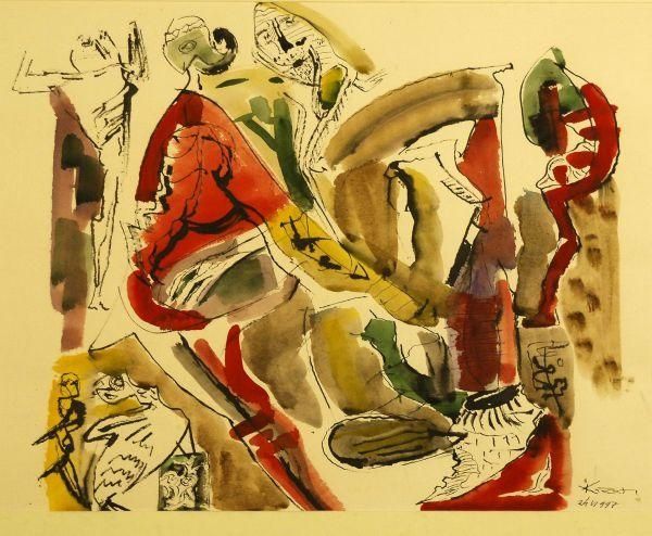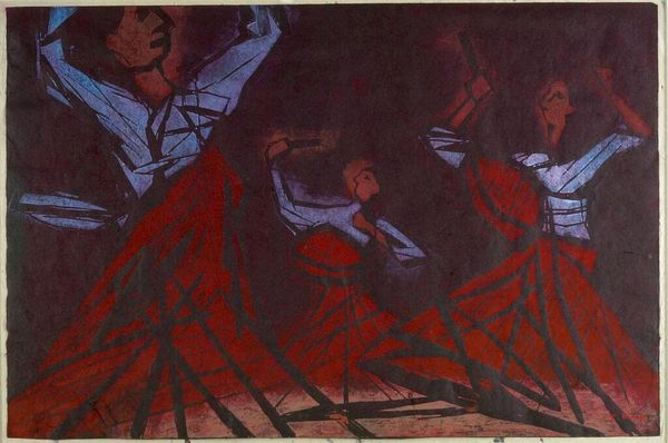 Editor: We're looking at Warrington Colescott's "A Moonlight Swim" from 1952, a color print featuring figures rendered in geometric, abstract shapes. It strikes me as almost chaotic, a swirling of color and form. What's your interpretation of this work? Curator: Well, seeing this work through an activist lens, particularly considering its creation in the post-war era, I'm drawn to the anxieties it might be reflecting about the human body and its place in a rapidly changing world. Colescott seems to be dismantling and reassembling the body through abstraction. Do you notice the fragmented forms and the almost frantic energy? Editor: Yes, the fragmentation is quite striking. It prevents a coherent, singular reading of the figures. Curator: Exactly. Given the social and political context of the 1950s—the Cold War, anxieties surrounding gender roles, and emerging civil rights movements—one might consider these fragmented figures as representative of fragmented identities. Are they liberated by abstraction, or further alienated? What do the bright colours suggest in juxtaposition with the figures and the name of the print? Editor: It's a compelling idea. The colours add a certain energy to the composition, suggesting there's potential, and dynamism even if unsettling. Perhaps this "swim" is not as relaxing or recreational as it seems to be. Curator: Precisely. It asks us to consider whose bodies are represented, and whose stories are told – or obscured – through abstraction. It's not just about aesthetics; it's about power, representation, and the socio-political currents shaping artistic expression. This print almost feels like a critical inquiry into social narratives. Editor: I never would have thought about the figures and context that way! That the work really challenges us about thinking of identity and social change is an eye-opener. Curator: Art holds the power to express complex historical issues that remain relevant today.