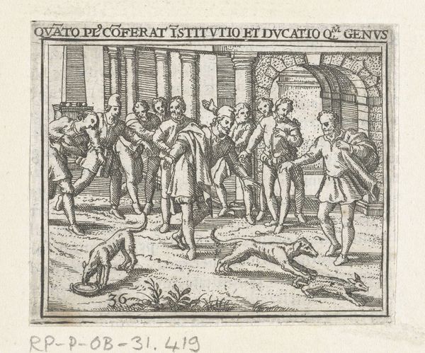 This engraving by Jan Luyken depicts the martyrdom of Cassianus, a teacher killed by his students in AD 302. The image is made using the technique of etching, a printmaking process that relies on the corrosive properties of acid to create lines on a metal plate, which is then inked and printed. The density of line conveys a sense of chaos and violence. Luyken masterfully uses the etched line to create contrasting textures, from the smooth skin of Cassianus to the rough clothing of his attackers. The medium itself allows for the reproduction of this scene, making it available to a wider audience. This relates to the burgeoning print culture of the 17th and 18th centuries, and the wider social impact of spreading information through reproducible images. The relatively inexpensive nature of printed images allowed for mass consumption, further influencing the public's understanding of religious and historical events. Ultimately, the choice of etching as a medium underscores the democratic nature of printmaking, as it provides the means of distributing narratives.