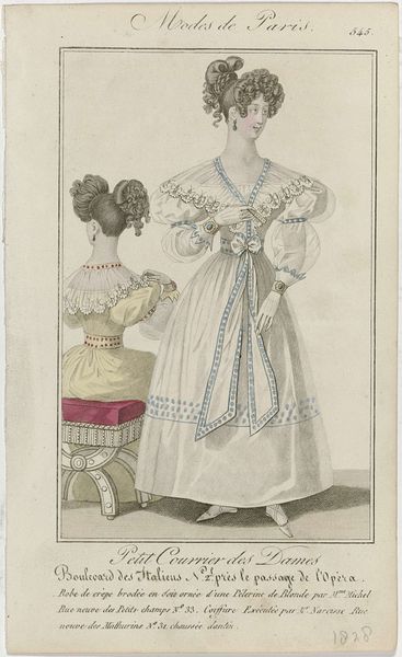 Curator: So, here we have an image titled “Petit Courrier des Dames, 1829, No. 657: Coiffure Exécute par Mr. Croisat...” from 1829. It is a print drawing with watercolour and illustrates the latest fashions in Paris. Editor: Oh, isn't this charming? It evokes a certain polite wistfulness, almost like peering through a slightly faded window into another era. The colours are so soft, faded to pastels. Curator: Absolutely. Fashion plates like this served as vital communication, disseminating style trends. What details draw your eye first? Editor: The woman’s hair, definitely. I see beehive styles re-emerging. It makes me wonder how much of that coiled effect is achieved through careful styling and how much with extensions or padding. It feels precarious. Curator: Good eye. Hairstyle was a statement. You can see its construction was carefully dictated as noted at the bottom. Beyond the hair, do you notice anything intriguing? Editor: I'm noticing a sense of controlled excess. The gown's fabric seems light, yet it's layered with ruffles and adorned with what look like floral details at the bottom and at the shoulders. The silhouette emphasizes the waist. A fascinating mix of airy delicacy and structured formality. I sense that ribbons also play an important symbolic role. Curator: Ribbons always did in clothing—especially as the middle class rose. I wonder too about the other figure seated off to the left: why is she sitting, almost passively? Editor: I perceive this arrangement, almost photographically staged. But consider the other. Perhaps the seated woman awaits her own "debut" moment. Is she observing, is she introspecting? And from where exactly do we, the observers, receive the image and interpret? It suggests that identities could always be curated and made into an image. Curator: Exactly, this artwork is both revealing and concealing. Well, reflecting upon the curated imagery and fashion, the "Petit Courrier des Dames" offered its readers just a glimpse of a fashionable world. Editor: Ultimately, it serves as a portal, doesn’t it? The whispers of lace, the promise of transformation through attire. I can almost smell the perfume through the aged paper.