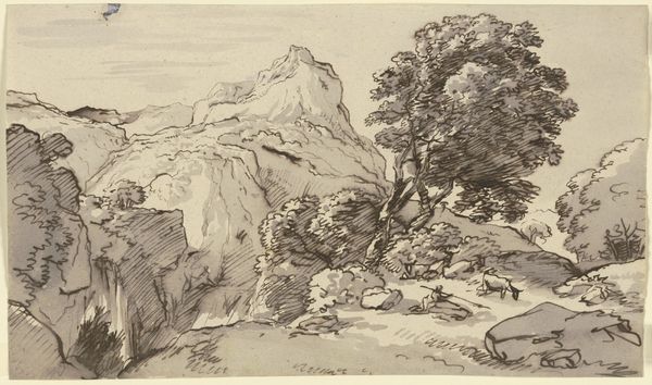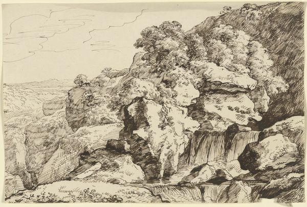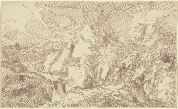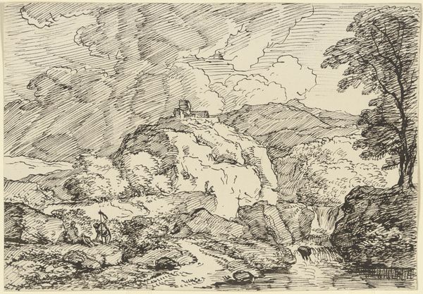 Editor: This is an intriguing piece! It's a drawing titled "Hilly Landscape with Figure in Foreground", the artist is unknown, and it appears to be made using pen, pencil, and ink on paper. It feels almost dreamlike, with swirling lines defining the landscape. What do you see in this work? Curator: I see a symbolic journey embedded within the landscape. Consider the figure in the foreground: dwarfed by the immensity of the hills. The journey motif is strong: what trials must this figure face as they negotiate this geography? Editor: That's a good point. The path is definitely not clear. How do the materials used, like the ink and the pen, contribute? Curator: Ink possesses a historical weight, particularly in landscape traditions of the East. It allows for layering and shading, but it also demands a certain confidence, a decisiveness of line. Note also how the line quality – at times flowing, at others scratchy – may reveal an ambivalence towards nature, the land appearing simultaneously nurturing and challenging. What do you make of the castle at the top of the hill? Editor: Oh yes! It's a bit obscured by the trees. It adds a narrative element – a destination, maybe? A symbol of authority? Curator: Or perhaps a symbol of aspiration, of an ideal just out of reach. Castles frequently carry those meanings across many eras. This is, remember, not just a pretty picture; it's potentially an externalization of an internal state. The figure seeks something, and we, the viewers, are invited to contemplate what it might be. Editor: That’s a much richer reading than I first considered! It shows how even seemingly straightforward landscapes can be loaded with meaning. I definitely see it differently now. Curator: Indeed, symbols often hide in plain sight. Once seen, the landscape resonates beyond its immediate appearance.