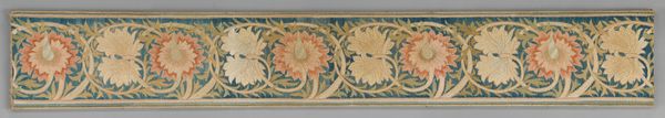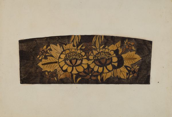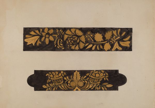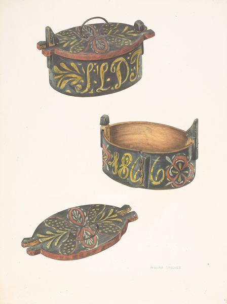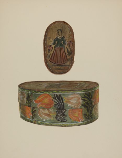 Curator: Welcome. Before us is "Hat Box," a coloured-pencil drawing by Walter Praefke, circa 1937. The drawing presents two views, one of the hat box's side and another of its lid. Editor: It strikes me as both antiquated and vibrant, if that makes sense. The color palette, mostly green and gold, provides a fresh counterpoint to the classical, almost baroque style. It evokes memories of older, perhaps family, heirlooms. Curator: Indeed, the stylistic clash contributes significantly. We have floral and organic patterns rendered with surprising linearity. Note the strategic deployment of colour that serves to emphasise these baroque features, providing a structural dynamism. Editor: Absolutely, though I also see a certain commentary embedded in the subject matter. The hat box itself whispers of bygone eras when social customs and performances around millinery held distinct meanings. There's a focus on gender, specifically femininity, that seems ready to be dissected. Curator: Undeniably, however, what intrigues is the use of coloured pencil, traditionally deemed a 'lesser' medium. Praefke subverts expectations through precision and detail usually associated with more 'refined' mediums, therefore pushing back against those perceived hierarchies of the period. Editor: That's interesting, that subversive approach echoes what was happening at the time period! Women were starting to find power through self-expression, the details being ever-so-important in this endeavor, perhaps? Curator: A fitting analysis! The application, while precise, allows for tonal gradations giving depth. One could further analyze through principles in semiotics: how floral arrangements functioned as societal symbols in interior spaces and visual culture during the interwar period. Editor: Thank you. Understanding this work requires sensitivity to the intersection of gendered expectations and emerging freedoms of the late 1930s and its continued resonance even now in relation to contemporary narratives on identity and societal progression. Curator: Thank you for elucidating. Through analysing "Hat Box," we've not only scrutinised artistry, but revealed the profound dialogue between art, structure and the shifting complexities that define our perceptions.