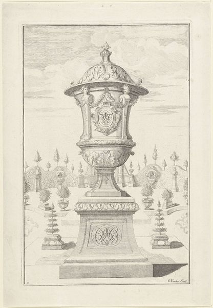 This print by Gerrit Visscher depicts a garden vase on a balustrade. The vase and architectural setting were achieved using the intaglio printmaking technique. It's a process where an image is incised into a plate, often copper, which then holds ink for transfer to paper. Looking closely, you see the fine lines that define form and shadow. The engraver's skill is evident in the precise execution of the vase’s ornate details and the architectural elements. Engraving is laborious. Each line you see had to be physically cut into the metal by hand. This wasn't just a means of reproduction; it was also a creative act shaping the final image. The choice of engraving elevates a common garden object to a symbol of status and artistic value. By focusing on process, we see how the status of the object and the skilled labor invested in its representation challenge easy distinctions between the decorative and the fine arts.