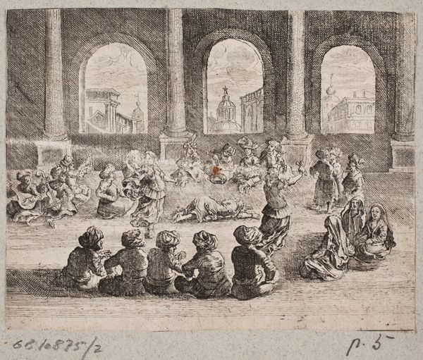 Curator: Let’s turn our attention to “Kerkdienst in een dorpskerk,” which translates to "Church Service in a Village Church." Eberhard Cornelis Rahms likely created this etching sometime between 1833 and 1890. Editor: What strikes me immediately is the subdued atmosphere; it’s quiet and contemplative. There’s an intimacy to the scene, despite the grandeur implied by the church setting itself. Curator: Rahms has masterfully used the etching technique here. Notice how the lines vary in density and direction, creating textures and shadows that define the space and the figures within it. Look closely at the varied levels of craftsmanship; there’s skill at play in both the construction of the church and the depiction of the common folk gathered for worship. Editor: The architecture is loaded with symbolic meaning, especially if this is the main church in the town; the light streaming inward makes that main arched entrance act as a portal, symbolically emphasizing access to divinity, for all community members. Curator: It's interesting you interpret the image this way! From my view, focusing on the materiality of religious practice invites us to think about how shared belief intersects with communal spaces. This image captures how these elements converge to shape a sense of collective identity and experience. Editor: Absolutely, I see that point. And consider how these depictions are imbued with socio-religious codes reflecting this era’s social and spiritual anxieties. Are those communal identities based on sincere conviction, or something more performative or obligatory? It’s hard to say for certain from looking at a simple etching, though. Curator: Indeed. The print functions as an efficient, reproducible artifact; in contrast to painting, we are not focusing on a singular aesthetic genius here but mass production in service to broad distribution, reflecting on consumption patterns of the era and highlighting new access to a representation of communal identity and space. Editor: Fascinating how different contexts impact how we assess images. Ultimately, I suppose these different contexts inform how the etching participates in dialogues on belief, and community—conversations that are just as vital today. Curator: I think I agree, yes; I feel the material circumstances can allow for unique perspectives regarding how art affects our collective values and experiences, though, ultimately!