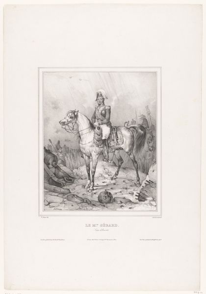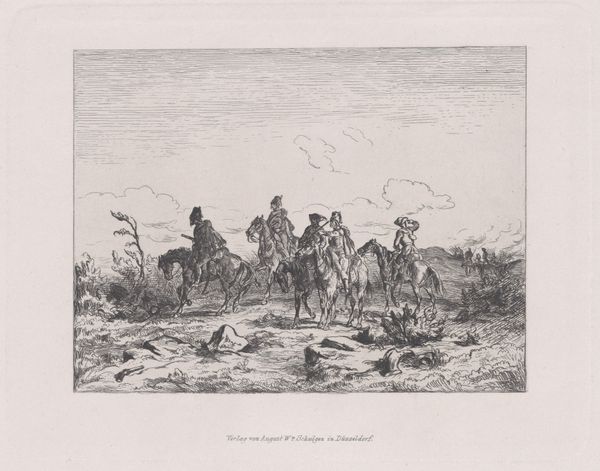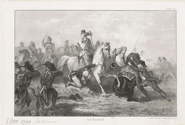 Curator: Allow me to introduce "Paard van de prins van Oranje raakt gewond bij Boutersem, 1831," or "The Prince of Orange's Horse is Wounded near Boutersem, 1831." This print, an engraving crafted by J.B. Clermans in 1831, depicts an incident during a turbulent time. Editor: My immediate reaction is to the composition. It's a rather stark image in black and white, the figures positioned almost theatrically. It appears to showcase a significant event but lacks dynamic movement, feeling somewhat static, doesn't it? Curator: The composition certainly guides the viewer. Clermans utilizes the principles of Romanticism to underscore drama. Note the use of line, the stark contrast of light and shadow, creating distinct shapes that define depth. The rigid formations versus the disarray in the foreground. What structural observations do you find interesting? Editor: Looking at it from a production angle, I’m struck by the meticulous process of engraving. Think about the labor involved to achieve this level of detail, translating this scene into a series of carefully incised lines. The artist meticulously cuts into the plate, building up the image layer by layer—each strike with the burin representing human exertion, human will. Curator: Yes, that dedication to process adds layers of understanding. Semiotics help to show that Clermans sought to communicate a clear, politically charged message, framing the Prince in a certain light amidst the ongoing conflict. It elevates the print beyond mere reportage into historical commentary. Editor: And that commentary must be interpreted through its means of production and distribution. Prints like these served as a primary means of circulating narratives about battles, figures, and nations at war. This tangible material tells us how history and politics can be molded. Curator: I appreciate the tangible, material qualities, as you mentioned, and how they offer a deeper comprehension of its creation, form, and narrative structure. Editor: And I find your careful visual readings fascinating. Both the artistry of structure and social production deepen the meaning and engagement of this engraving, truly.