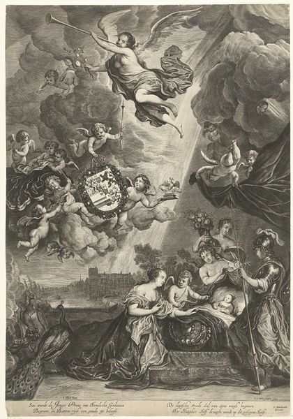 Editor: Here we have François van Bleyswijck's engraving, "Engel toont profeet Jesaja zijn profetieën," dating sometime between 1681 and 1739. The cascading composition strikes me as dramatic, but the real narrative feels locked away in symbolism. What do you see in this piece, from your perspective? Curator: It's a fascinating piece, isn't it? The dramatic composition isn’t just aesthetic; it's functional. Note how Isaiah shrinks beneath the angels bearing visions in celestial spheres. Consider what it means for prophecies to be presented as images held by angels – are these prophecies somehow separate from Isaiah, mediated through divine beings, objectified? And notice the angel pointing toward those future visions. It evokes a journey through time, shaped by cultural memory. Editor: That’s interesting - objectified prophecies. The use of spheres feels significant too; almost like viewing different worlds. Is the angel pointing acting as an interpreter, clarifying that prophetic trajectory? Curator: Precisely. That gesture serves to solidify Isaiah's role not just as a prophet, but as a witness – a passive receiver of history yet to unfold. This active gesture redirects Isaiah’s gaze, solidifying his transition from mere mortal to vehicle for divine foresight. These are all important reminders of the psychological weight tied to the interpretation of prophecy within this historical context. Editor: So the imagery underscores a sense of divine control and perhaps a burden on the prophet, presented with an inevitable future. It definitely enriches my understanding of Baroque art! Curator: Indeed. It is how these symbols work over time; bearing and shaping beliefs, memories, and even fears. That transfer is a complex tapestry that continues to intrigue.