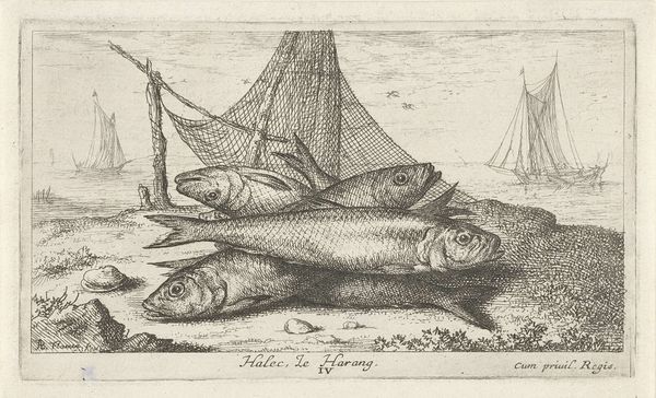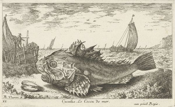 Editor: So, here we have Albert Flamen's "Steur op het strand," or "Sturgeon on the Beach," created around 1664. It's an etching, full of incredibly fine lines. The sheer size of the fish compared to everything else creates a somewhat absurd feel. What jumps out at you when you look at this print? Curator: It's odd, isn't it? That huge, almost cartoonish sturgeon dominates the scene, while in the background, life buzzes on with fishing boats and what looks like a naval battle! I think Flamen’s playing with our perception of importance. We tend to focus on grand historical events, battles, you name it! But what about the everyday wonders of nature, like this magnificent fish? Editor: That’s a great point! I hadn't considered that the artist may be satirizing how we interpret historical subjects. How did sturgeon fit into seventeenth-century Dutch culture? Curator: Sturgeon was a delicacy. Beyond that, this print encapsulates a lot about the Baroque era; the dramatic composition, an interest in the natural world… Maybe there's a comment here about Dutch prosperity built upon resources, and a gentle ribbing of their own obsession with exotic goods. Editor: I like that idea! The naval battle combined with the scale of the sturgeon could suggest prosperity resulting from nature. Curator: Absolutely! Look how delicately the artist uses line to define not only the texture of the fish, but also the activity in the background, from waves on the sea, to the buildings at the top left. Did anything about the image mislead you? Editor: Initially, I didn’t understand that the image was an etching because of the incredible detail, making it look photorealistic. Curator: It’s a good reminder to always look closely, isn’t it? There’s often more than meets the eye. Editor: Definitely! I’ll think about this piece – and sturgeon – differently from now on!