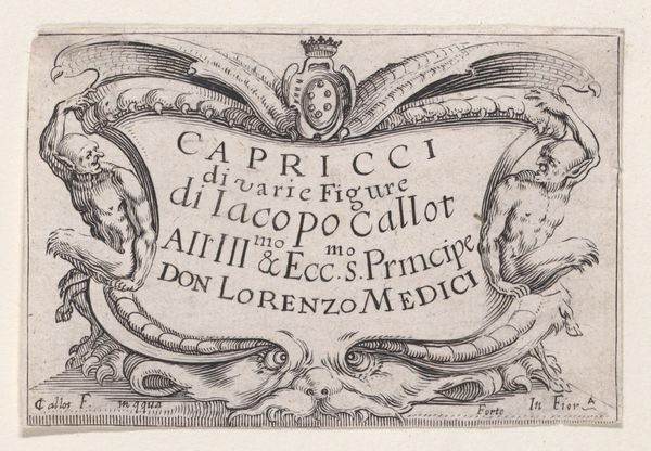 Curator: Here we have a 1579 engraving titled "Langwerpige cartouche met trossen fruit," or "Elongated Cartouche with Bunches of Fruit," created by an anonymous artist. Its design, typical of Renaissance printmaking, combines typography with decorative elements. Editor: Immediately, the meticulous labor involved in such a precisely detailed work jumps out. What tools would have been required to incise such delicate lines onto the printing plate? And, considering the time it would take, what class of consumer would purchase such images? Curator: Well, look closely. Note the lettering—"POICTOV" and above it "Septemtrio"—set against the highly stylized border of the cartouche, which, yes, features meticulously rendered bunches of fruit. The linear precision, the calculated balance between text and image… it's a masterclass in Renaissance formalism. Editor: True, but even the composition serves the message. Consider how these ornamented borders support and elevate the central text; or perhaps even serve to visually authorize "POICTOV" itself—likely a place or province? The very act of printing allows it to be multiplied and distributed, carrying a symbolic value linked to emerging notions of place and territory. Curator: Certainly. And what makes it a compelling work of art is not just its functionality, but the artist's careful arrangement of space and form. Observe the use of symmetry, the subtle variations in line weight. How the ornamental details lead the eye to the central word and anchor the work in its Renaissance visual lexicon. Editor: That’s exactly my point: the mode of production is central! An engraving isn't spontaneously generated—it’s constructed. Each stage involves choices and craft from the engraver as artisan and disseminator of information. What materials were chosen for permanence and replicability, how does this then feed the emerging market for printed material? Curator: All important facets, to be sure. Yet in its exquisite rendering, and considered design, the print transcends utility. It reminds us of the power of artistic formalism to distill and express the values of an age. Editor: Agreed; though its materials also offer tangible evidence of labor practices. We need to consider those human relationships that bind artist to artifact and the world they help represent.