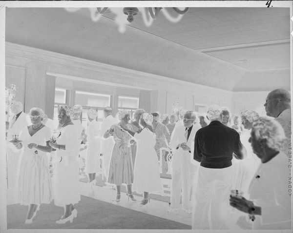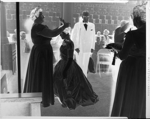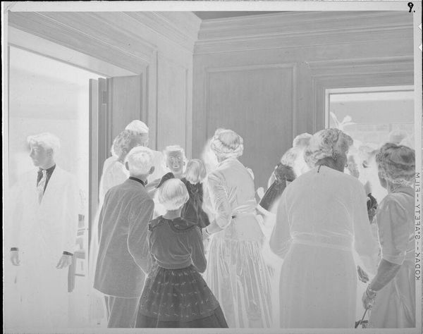 Curator: Here we have an untitled photograph by Martin Schweig, held at the Harvard Art Museums. The composition immediately strikes me as rather theatrical. Editor: Yes, it’s a departing couple framed by onlookers. Note how the figures create a visual rhythm, a dance of light and dark across the image. Curator: Precisely. The socio-economic context also plays a role; the image likely captures a moment of privilege and social ritual, departing from a wedding celebration. Editor: The contrast is stark, almost harsh. The high key flattens the subjects; it really emphasizes the costumes, the artifice of the scene. Curator: Given the lack of specific details, it invites broader reflections on marriage, performance, and the gaze of society. Editor: Agreed. The picture presents a compelling study in form and social dynamics.